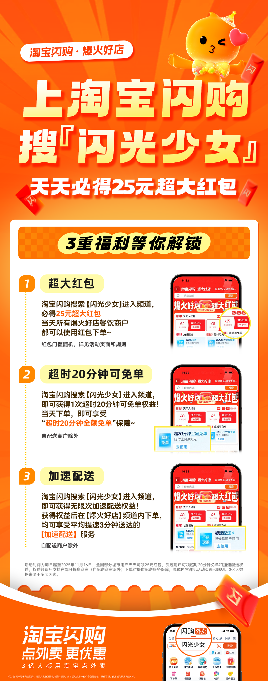从今天起,一直到11月30日,上淘宝闪购搜【闪光少女】,每天都能领到25元的超大红包。