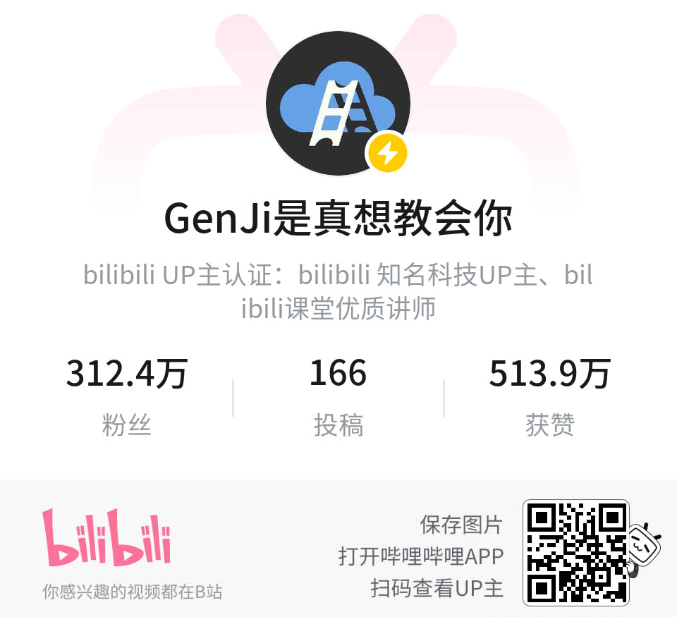 - 在B站搜索GenJi是真想教会你或扫描下方二维码,进入我们的频道。