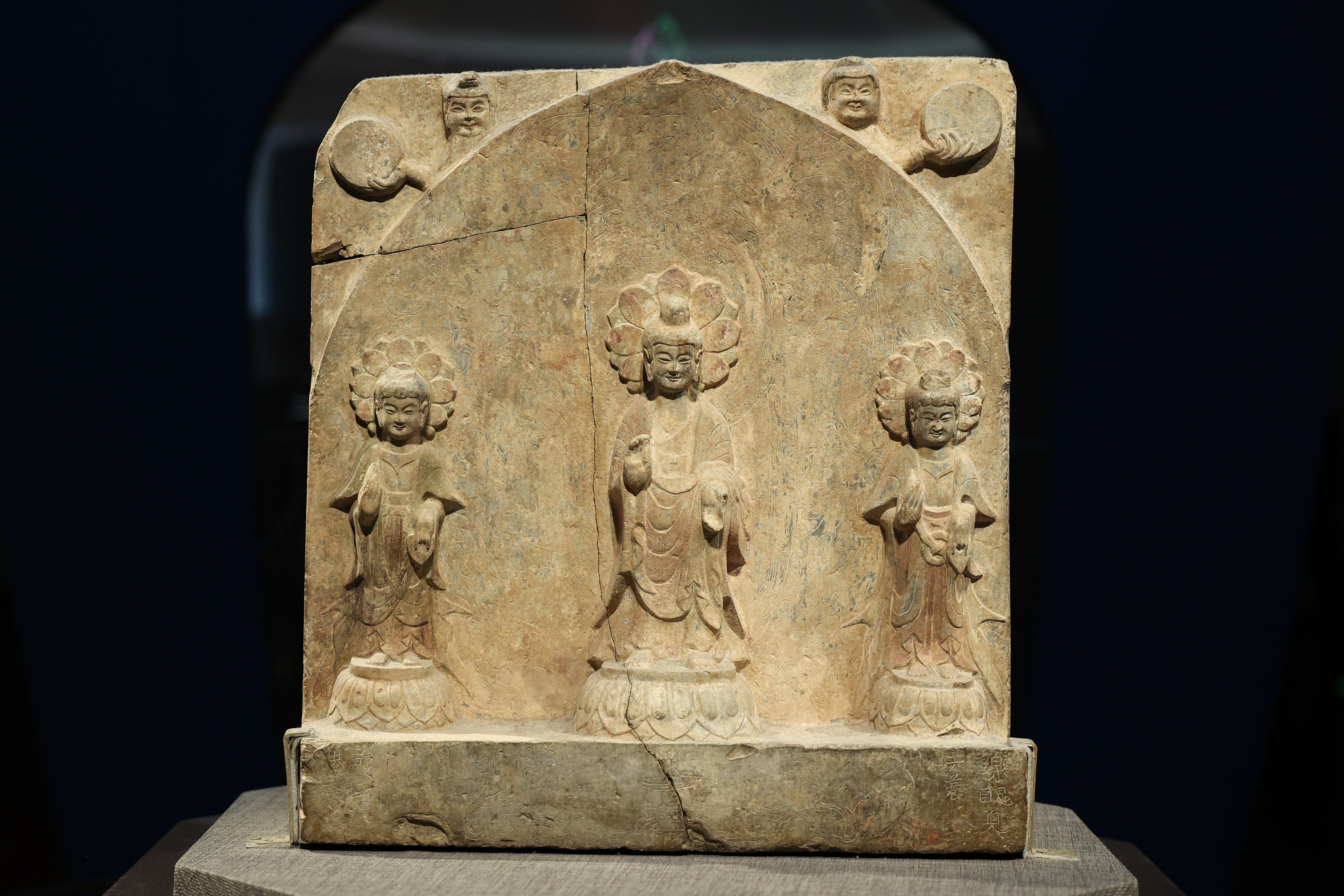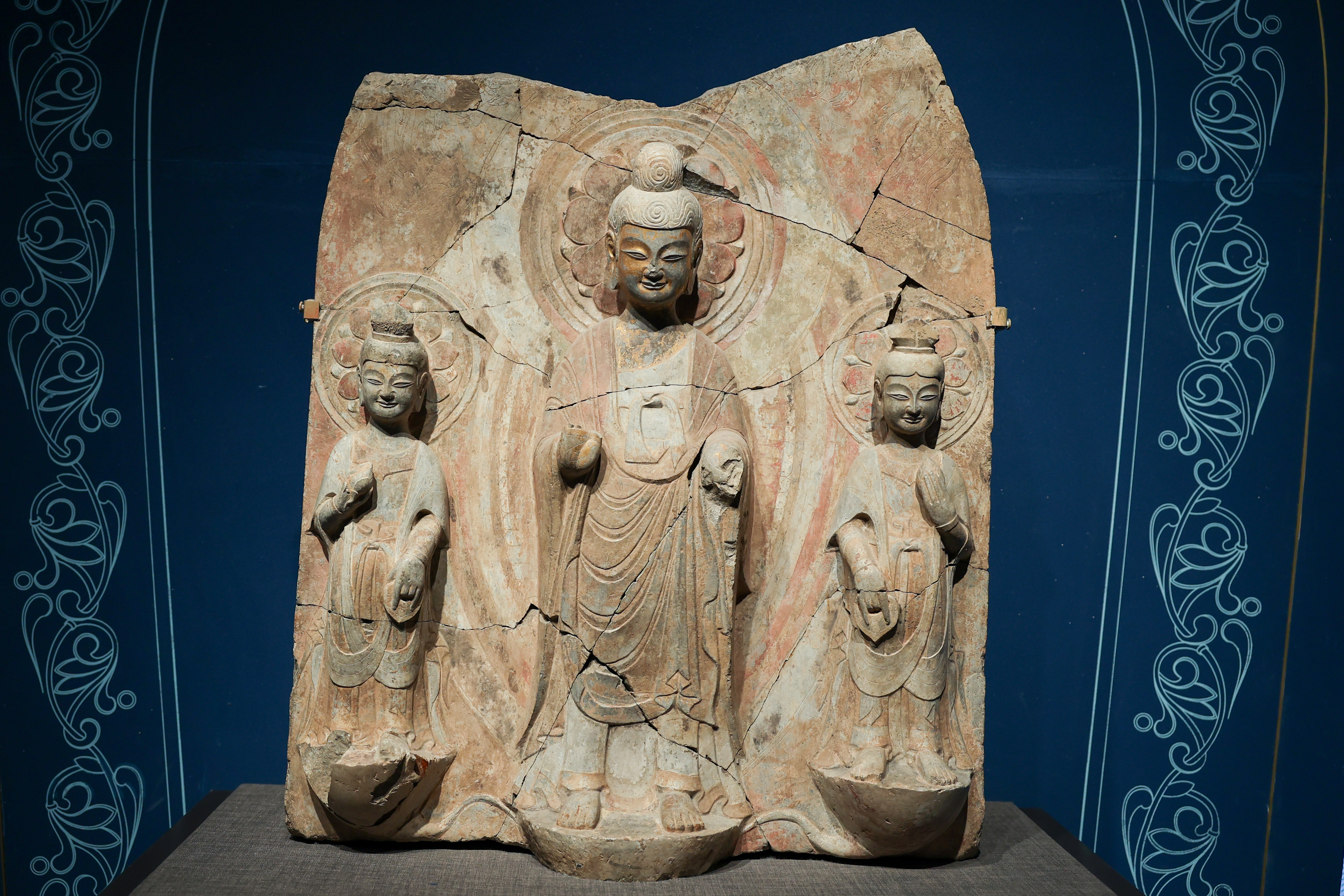 北魏晚期 贴金彩绘背屏式佛菩萨三尊像 青州博物馆藏(下图)