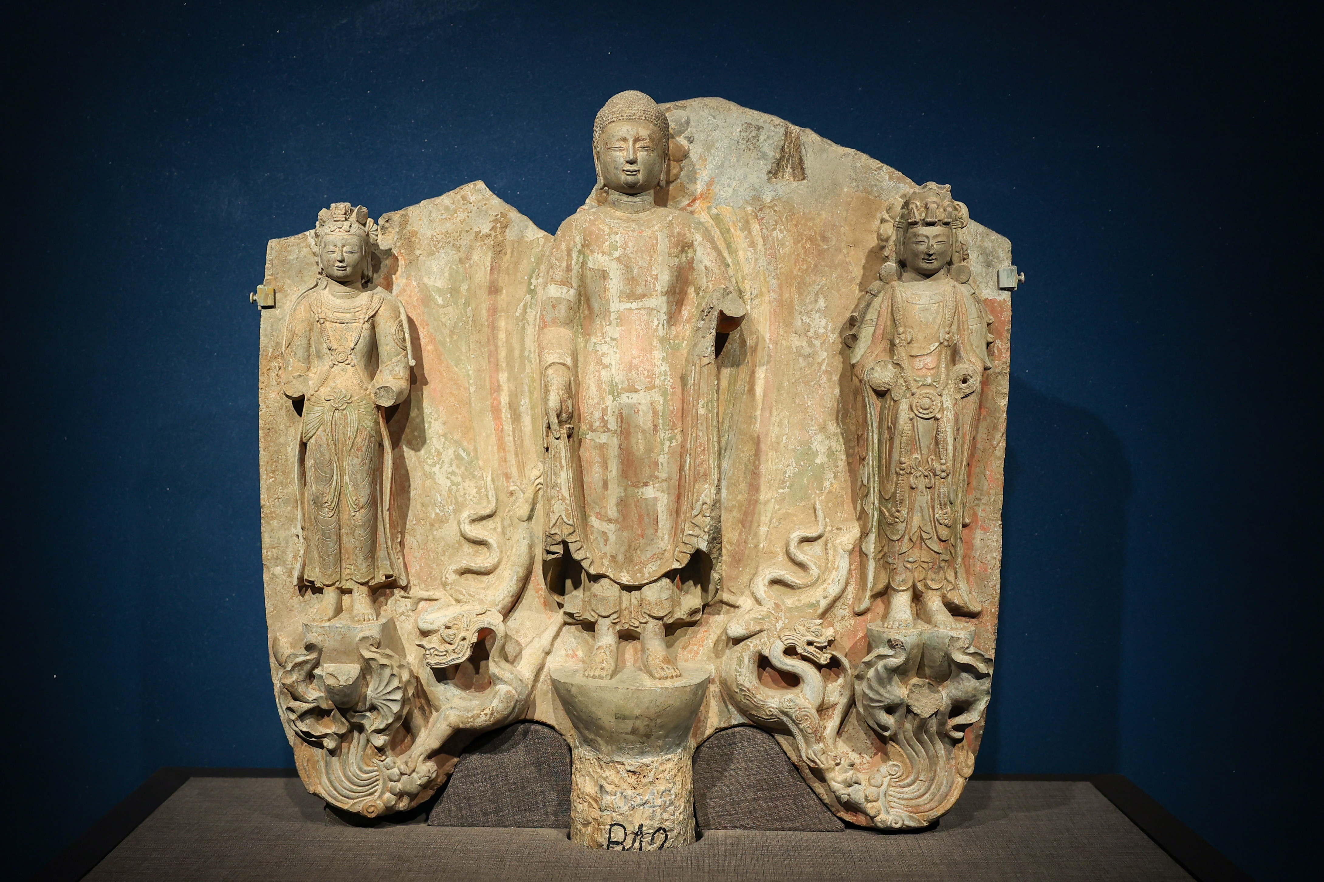 东魏 贴金彩绘背屏式佛菩萨三尊像 青州博物馆藏(下图)