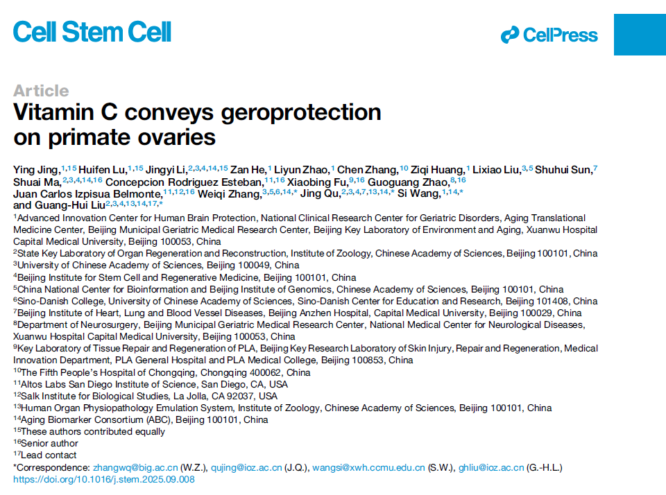 1. Jing Y, Lu H, Li J et al. Vitamin C conveys geroprotection on primate ovaries. Cell Stem Cell. 2025 Oct 14:S1934-5909(25)00339-X. doi: 10.1016/j.stem.2025.09.008. Epub ahead of print. PMID: 41092909.2.