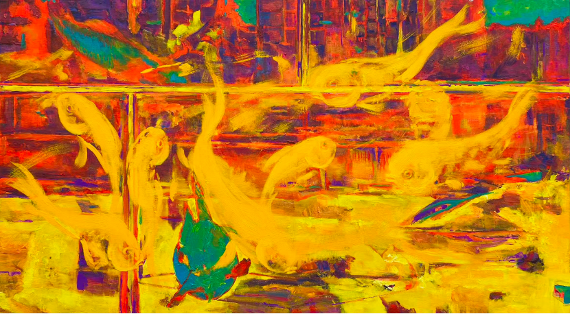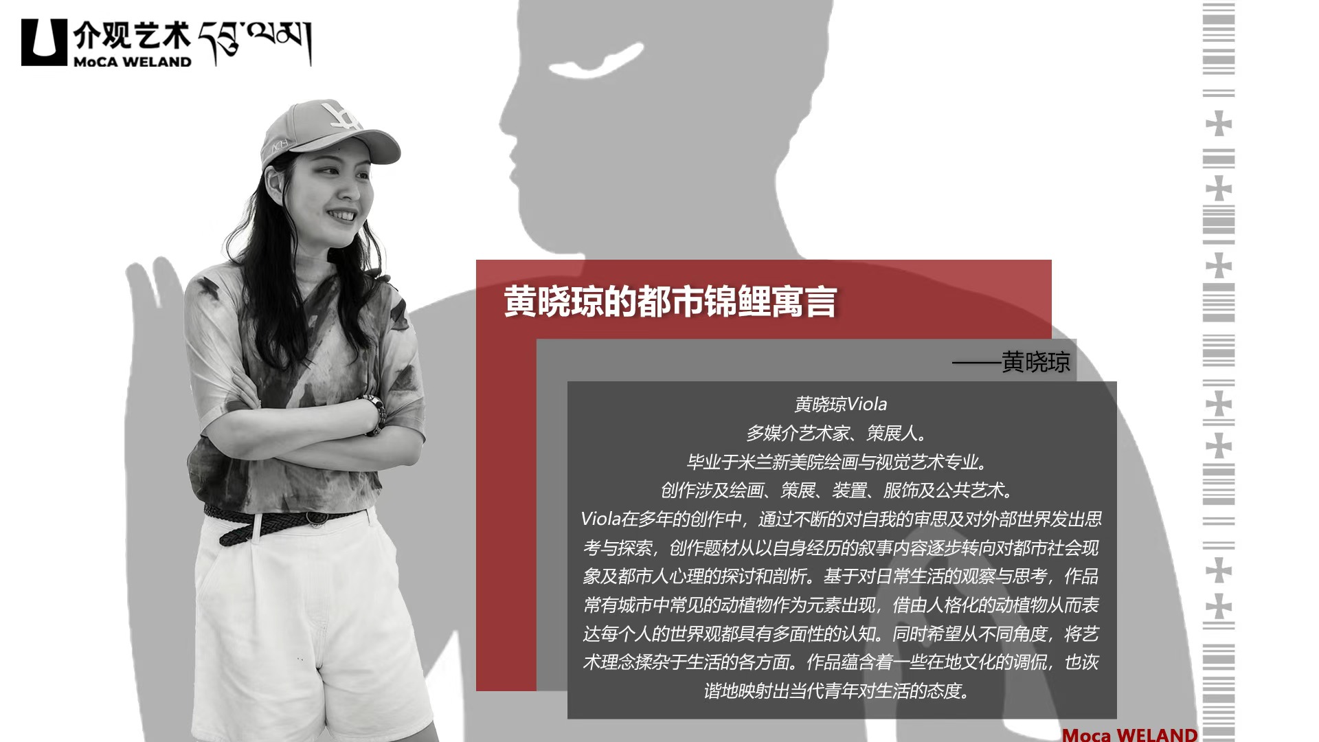 “我为何是我?身为锦鲤是否已经注定生来就是“观赏型动物”,无法被返归大自然中?锦鲤在古时候就是一个被象征着瑞祥之兆的符号,人们会因为获得祥瑞而高兴欢呼,而作为祥瑞的锦鲤是在想什么?城市在日益拓张,原始传统的技能与文化在逐渐消失。因此以传统锦鲤的绘画方式结合被强饱和度打破认知的影像,思考城市人与自然、革新与传统之间的关系。”——黄晓琼
