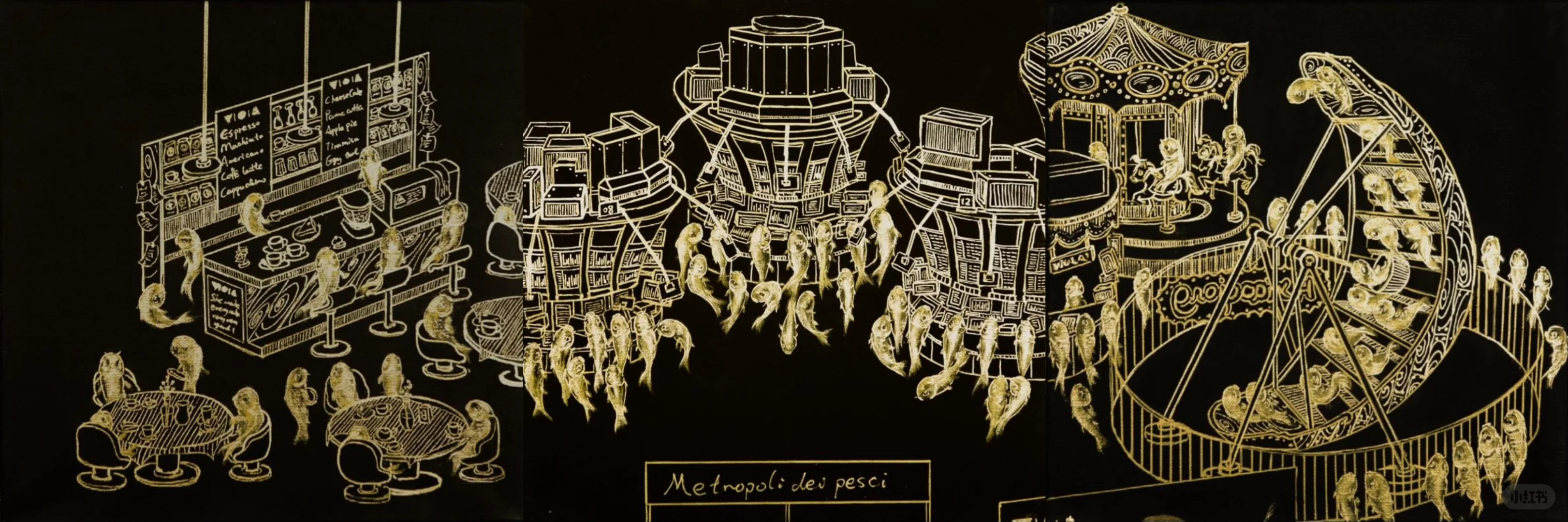 黄晓琼创作《MetropoliDei Pesci》(金鱼都市)的缘由是来自于自身及周遭的经历,意识到了都市中的情绪病患病率。而大胆采取金鱼作为主要象征符号,认为都市人与金鱼之间存在一定的共通点,表达自己对社会问题的看法与认知。主观断定金鱼由于生活在透明的鱼缸中,充满了持续的焦虑及敏感,不断地在思考“我是谁?我在哪?我要做什么?”,这像极了解构存在的目的与意义的哲学问题。同时也映射出生活中的“鱼群效应”。