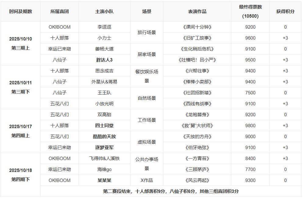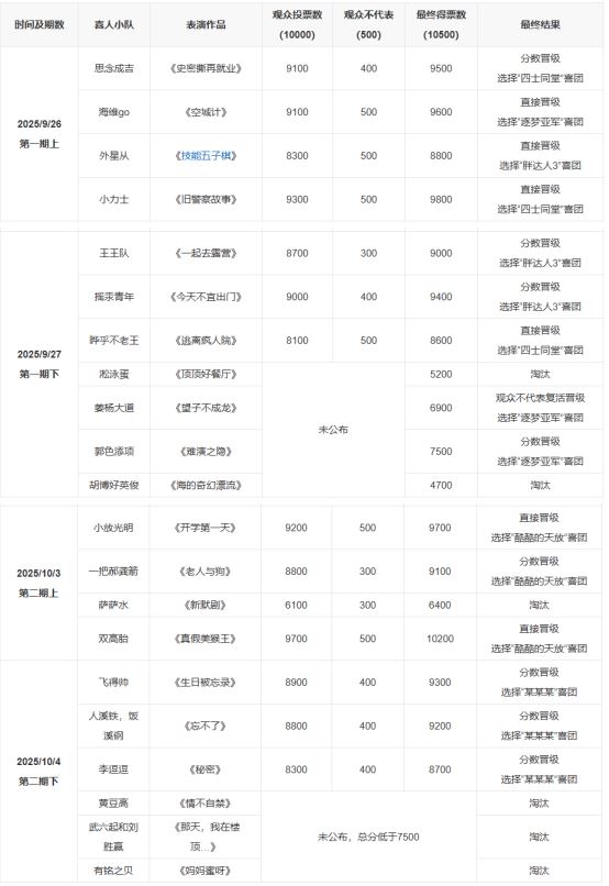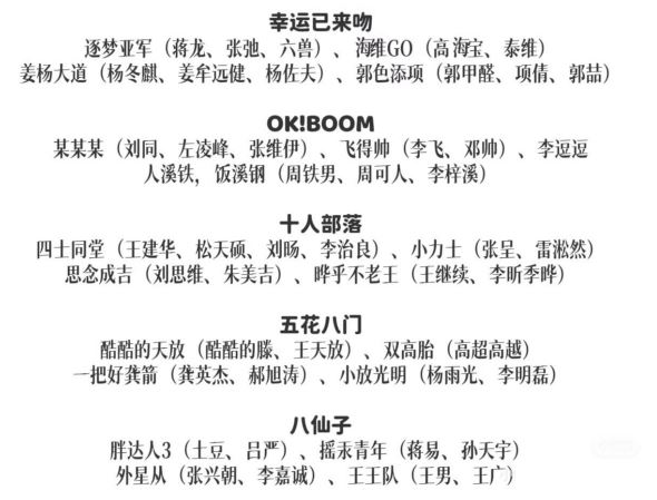 以下是第一至第四期节目的详情、打分和五个喜团的人员表