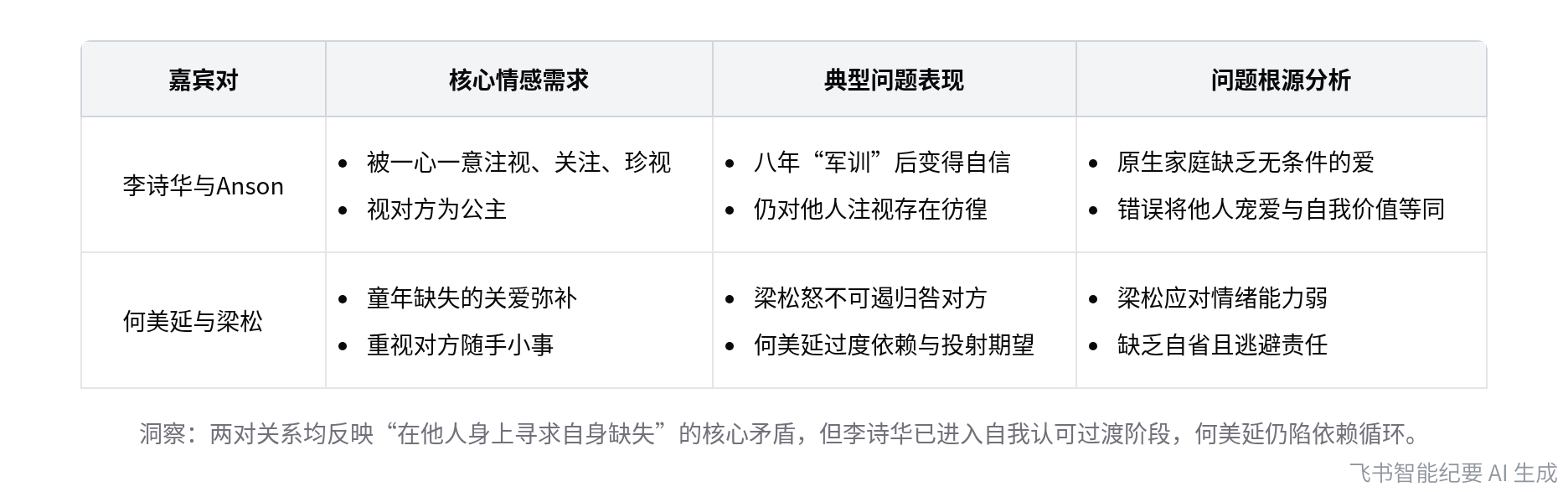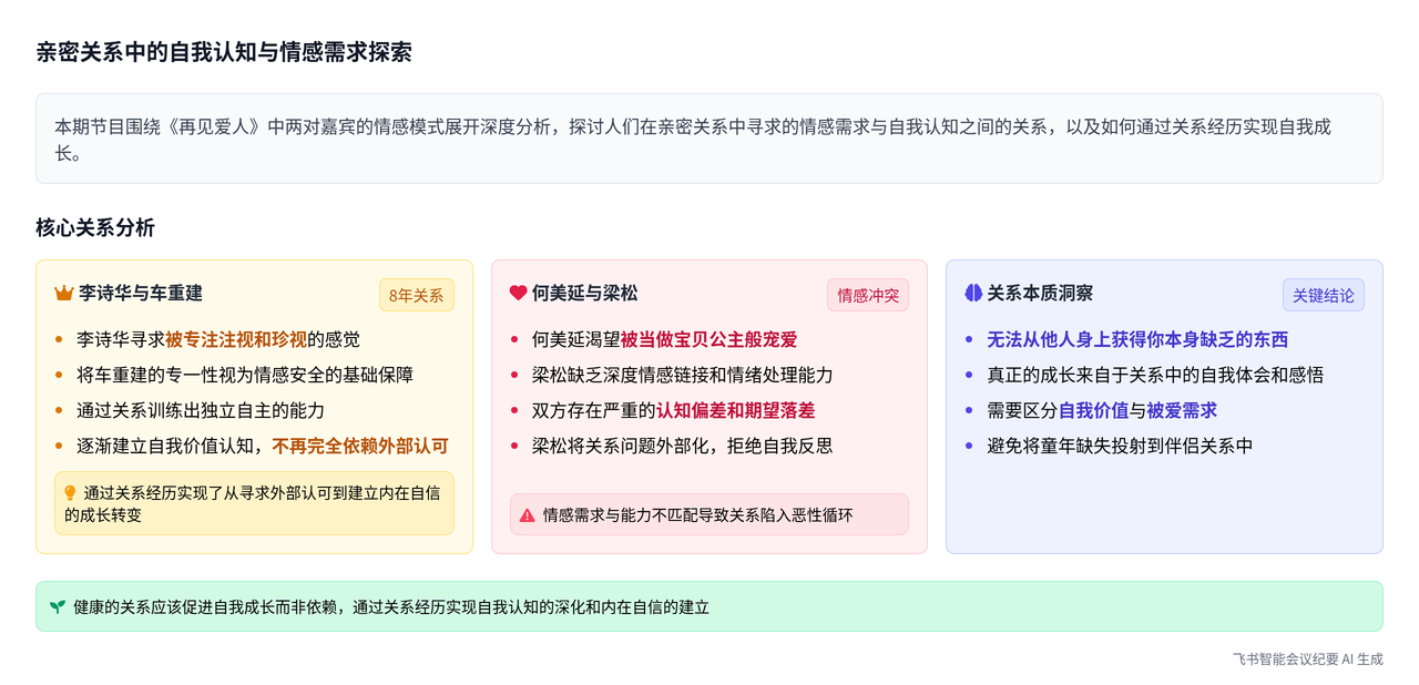 下面先贴上两张AI做的会议纪要:本期主要就是在聊,当你非要用伴侣来补齐你缺失的部分,你大概率会南辕北辙。