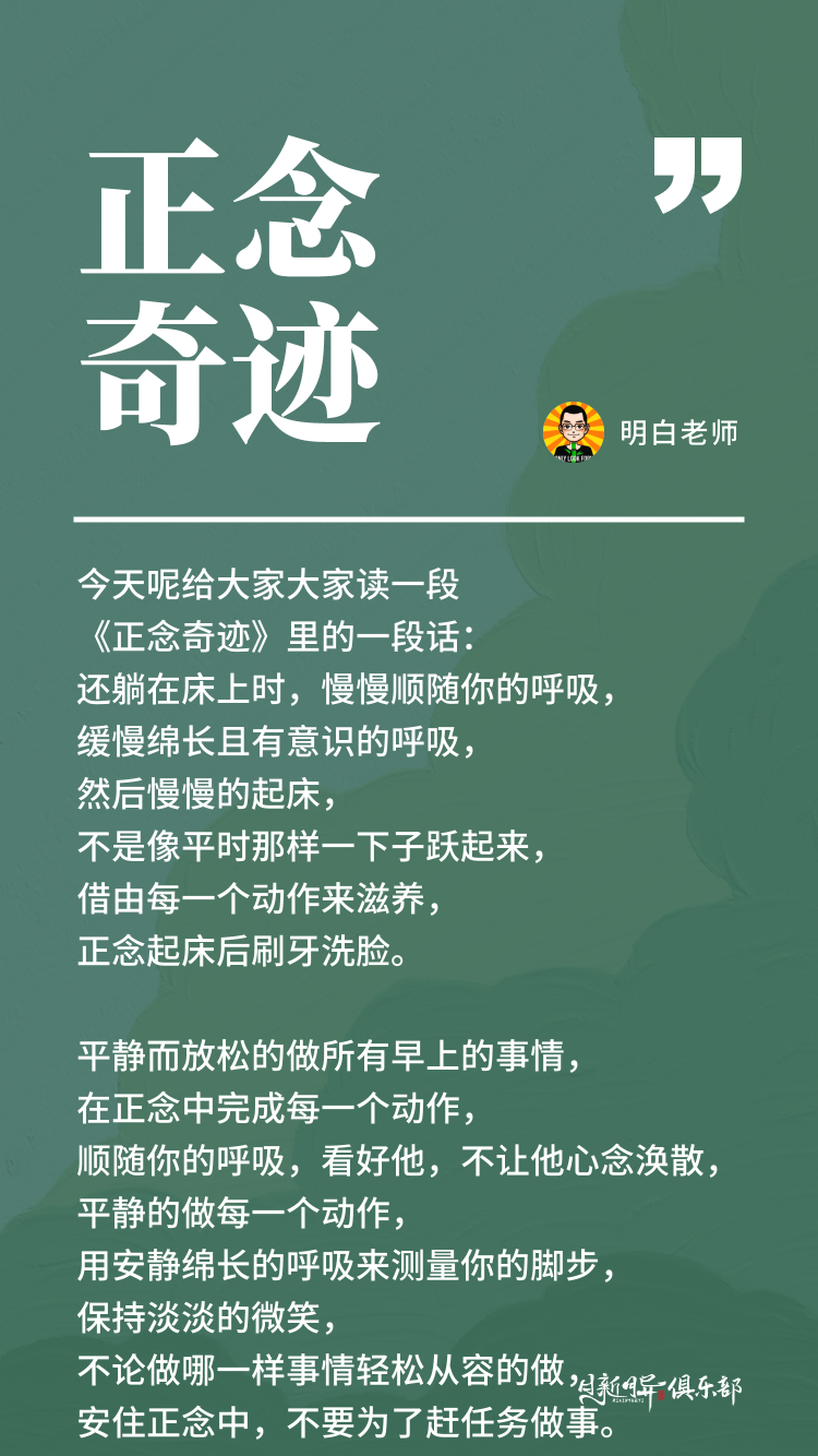 今天呢给大家大家读一段《正念奇迹》里的一段话:还躺在床上时,慢慢顺随你的呼吸,缓慢绵长且有意识的呼吸,然后慢慢的起床,不是像平时那样一下子跃起来,借由每一个动作来滋养,正念起床后刷牙洗脸。