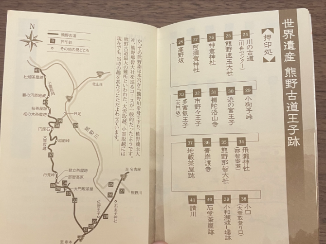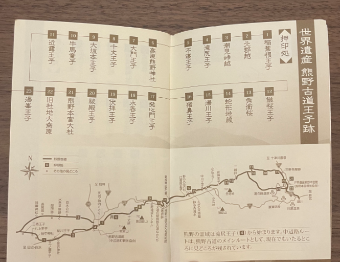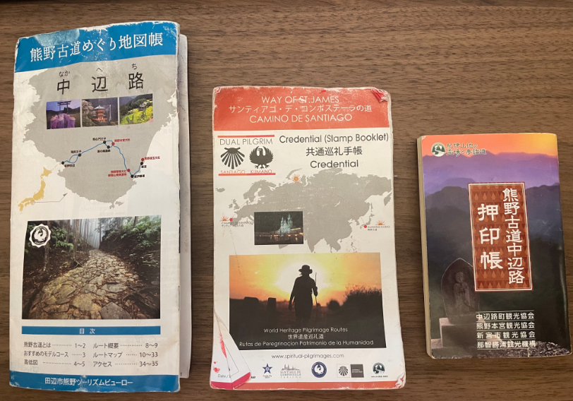 中边路地图手册(特别实用)、双朝圣盖章侧(中)、熊野古道中边路41个章小册子(右)