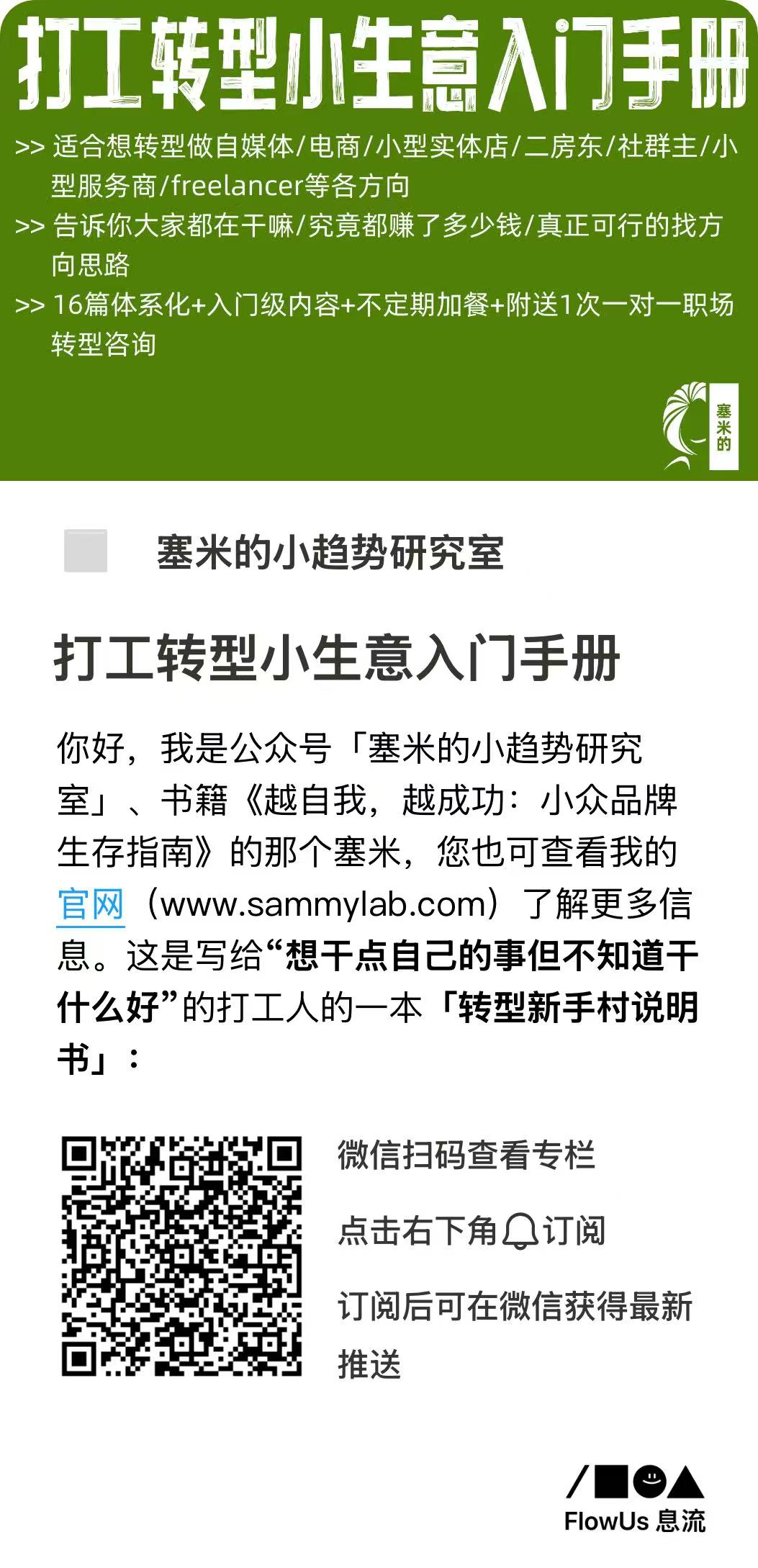 如果你正在经历转型或者在做一件自己的小生意,欢迎购买塞米《打工转型小生意入门手册》,将更全面的帮你把浪漫梦想,变成可活下去的坚实孤舟。