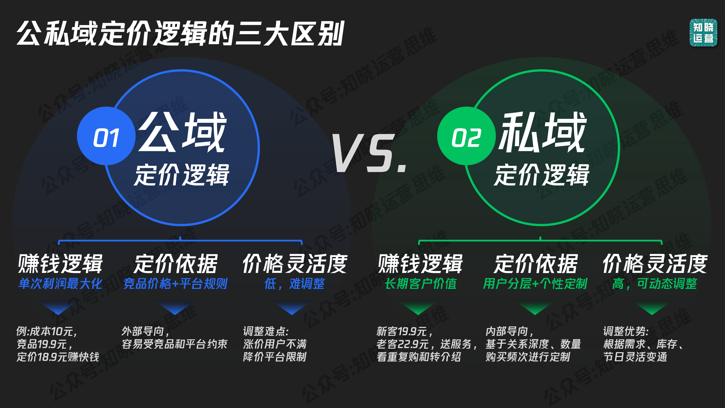 - 私域定价与公域定价在赚钱逻辑、定价依据和价格灵活度上差异显著,这些差异的核心原因是什么?