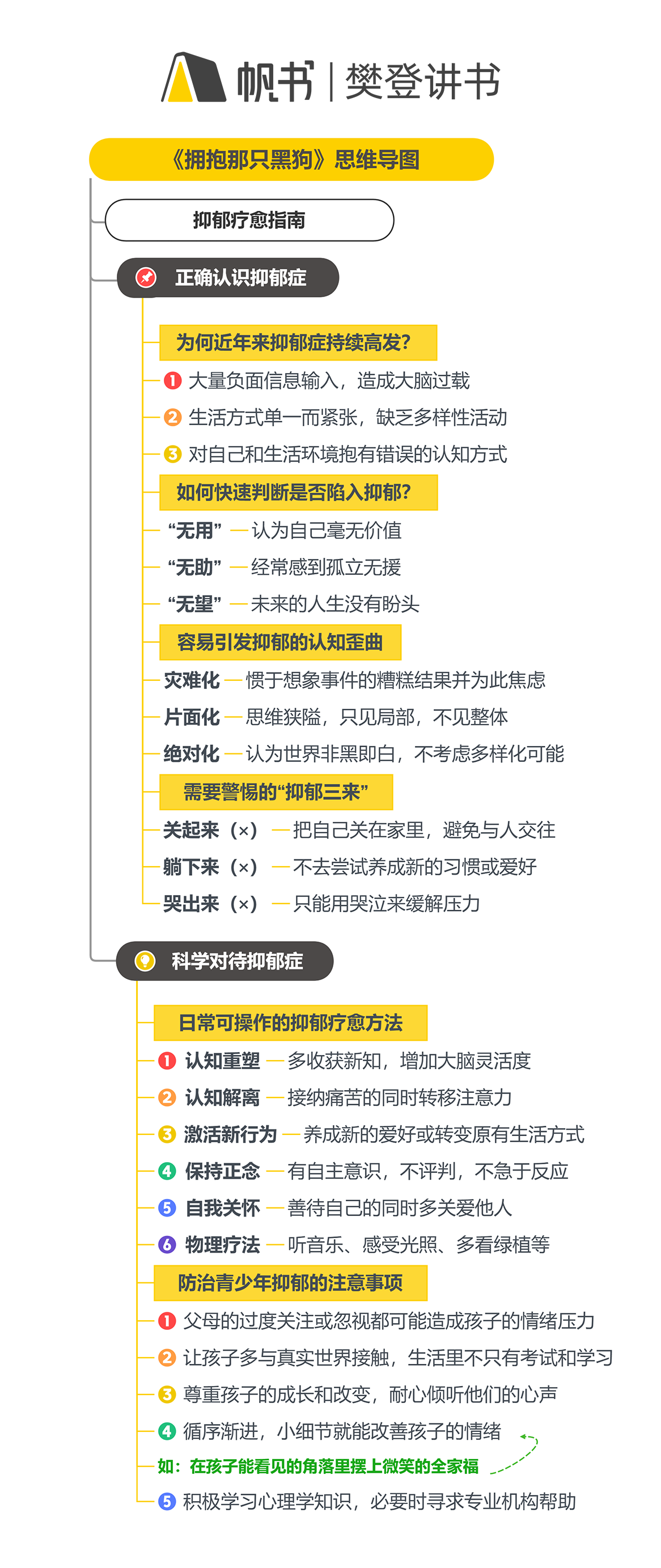 主播介绍——樊登樊登,帆书(原樊登读书)创始人、首席内容官。《可复制的领导力》、《低风险创业》、《陪孩子终身成长》作者。国际大专辩论赛冠军。本期嘉宾——汪瞻汪瞻,于斯坦福大学取得博士学位后回国从事心理工作,使用认知行为疗法等循证治疗技术为抑郁人群提供帮助。思维导图——《拥抱那只黑狗》
