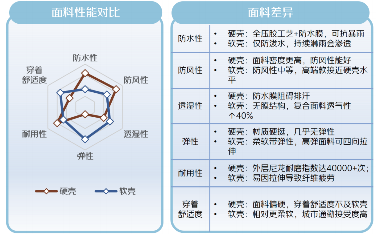 冲锋衣的核心竞争力在面料,白皮书用详细图表拆解了软壳与硬壳的核心差异: