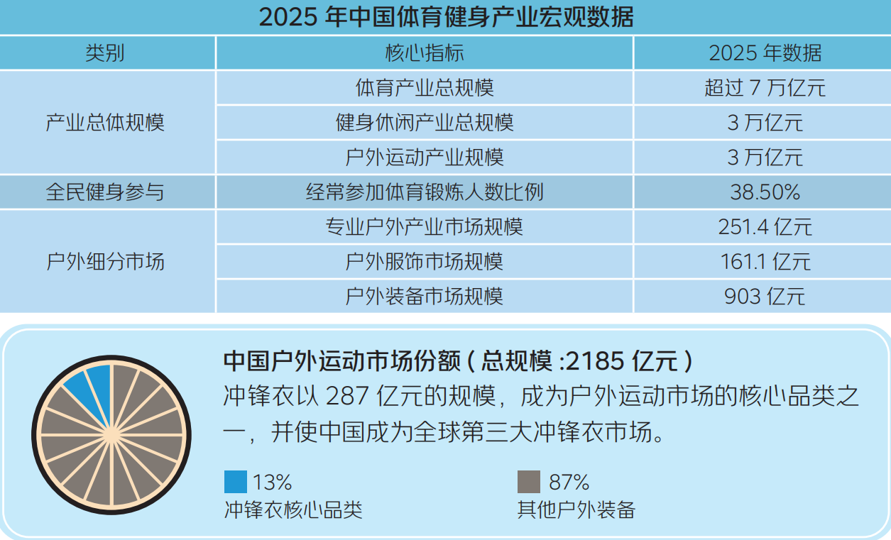 白皮书用硬核数据证明了冲锋衣赛道的高景气度。2025 年中国户外运动市场总规模达 2185 亿元,其中冲锋衣以 287 亿元规模占比 13%,成为绝对核心品类: