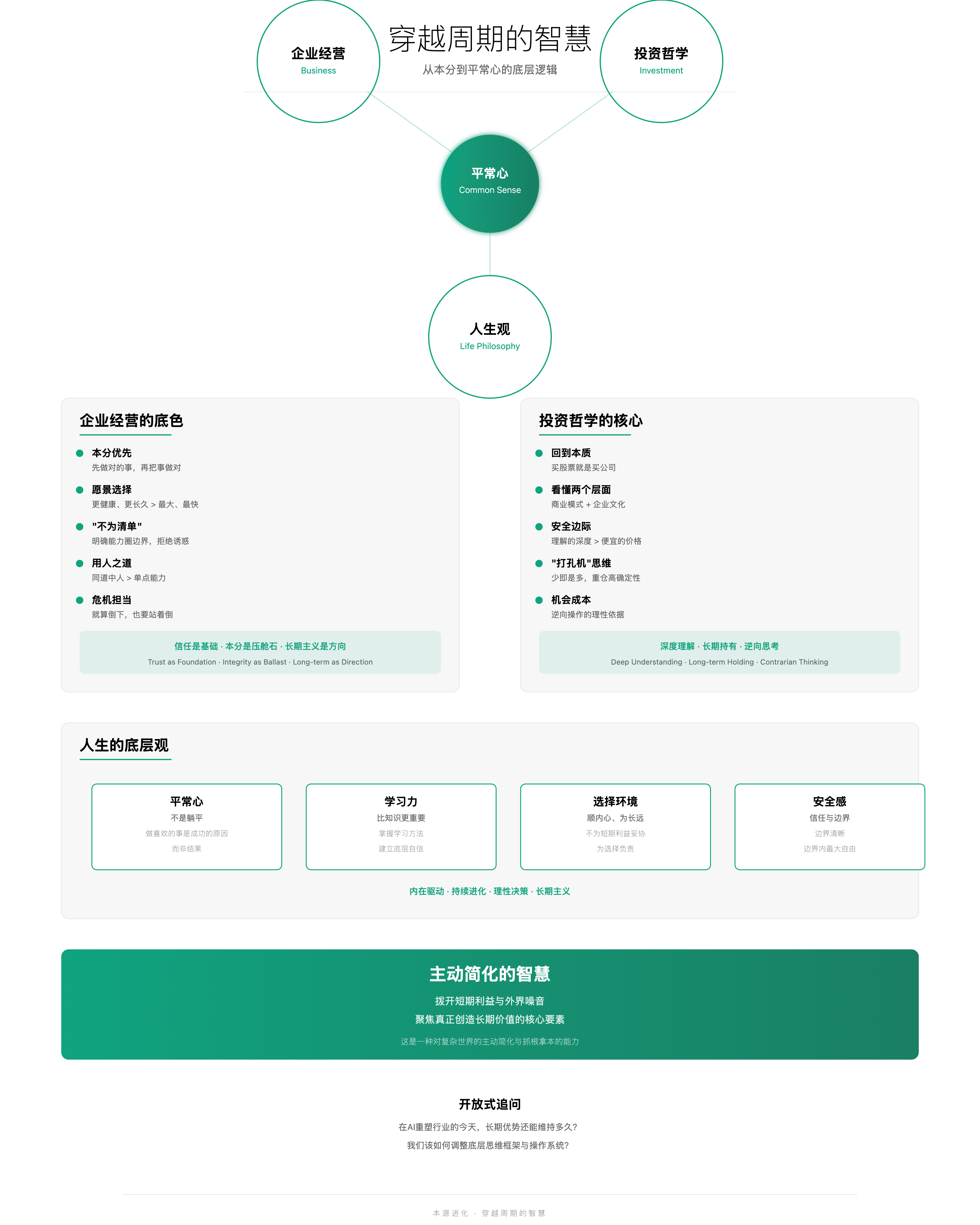 - 企业经营:本分优先、信任为基、愿景求“健康与长久”;用“不为清单”守能力圈;同道中人 > 单点能力;授权 + 承担;危机中以担当稳住信任。