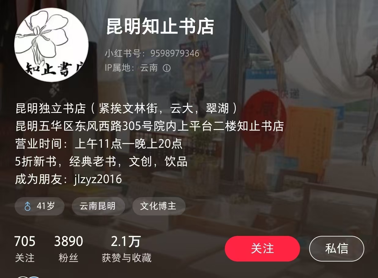 这是他的小红书账号”昆明知止书店“,欢迎喜欢逛书店的朋友,有空来他书店玩!
