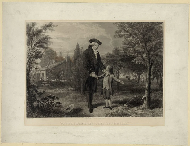 小乔治与樱桃树的故事(图左为华盛顿的爸爸),这个华盛顿砍树的故事是后人编造的