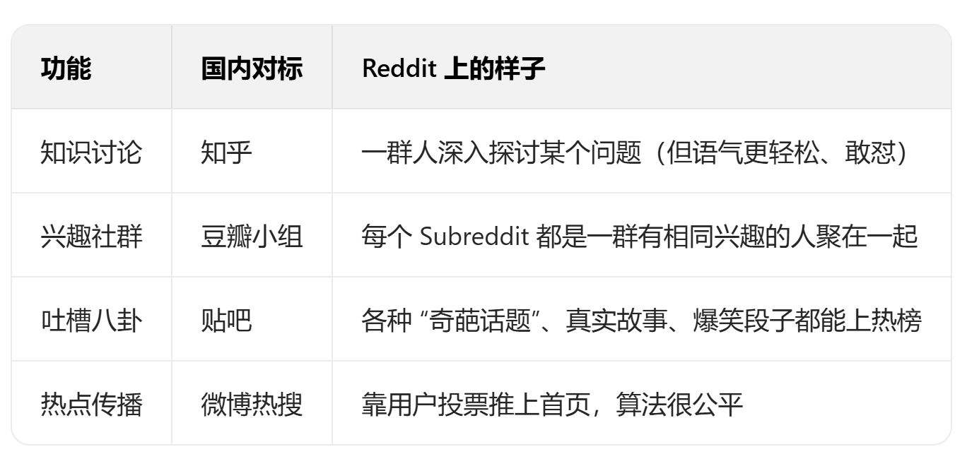 - 由兴趣驱动的全球社区网络,包含无数细分的兴趣社区(Subreddits)。
