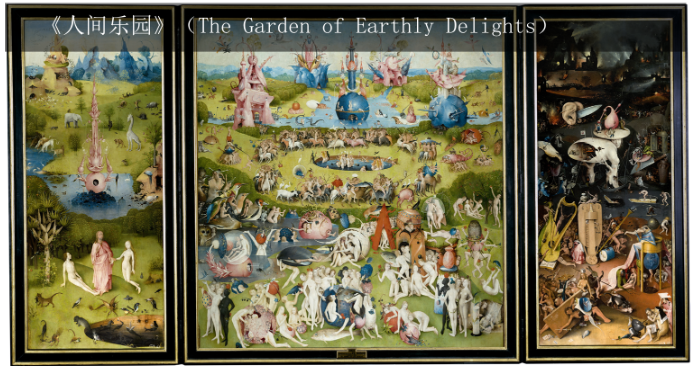 左翼描绘了伊甸园,象征人类的起源。中间画面充满无数裸身男女,描绘人类沉迷于欲望与享乐的世界。右翼展现地狱的场景,充满折磨、惩罚与怪诞的梦魇式意象。