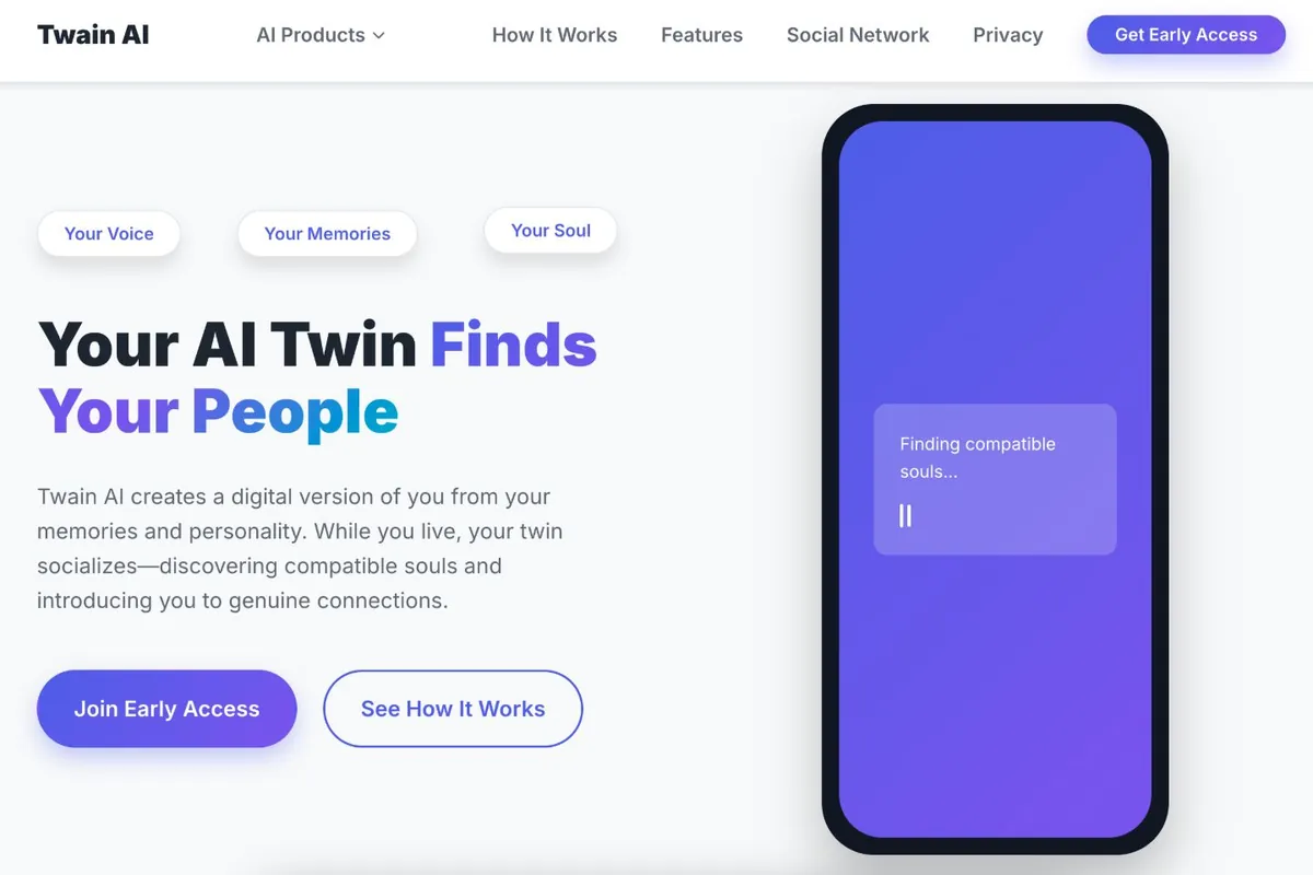 1️⃣ 第14周产品:Twain AI + Soul AI —— 复活一个2019年的梦想,打造带语音、情感和个人记忆的“数字孪生”。