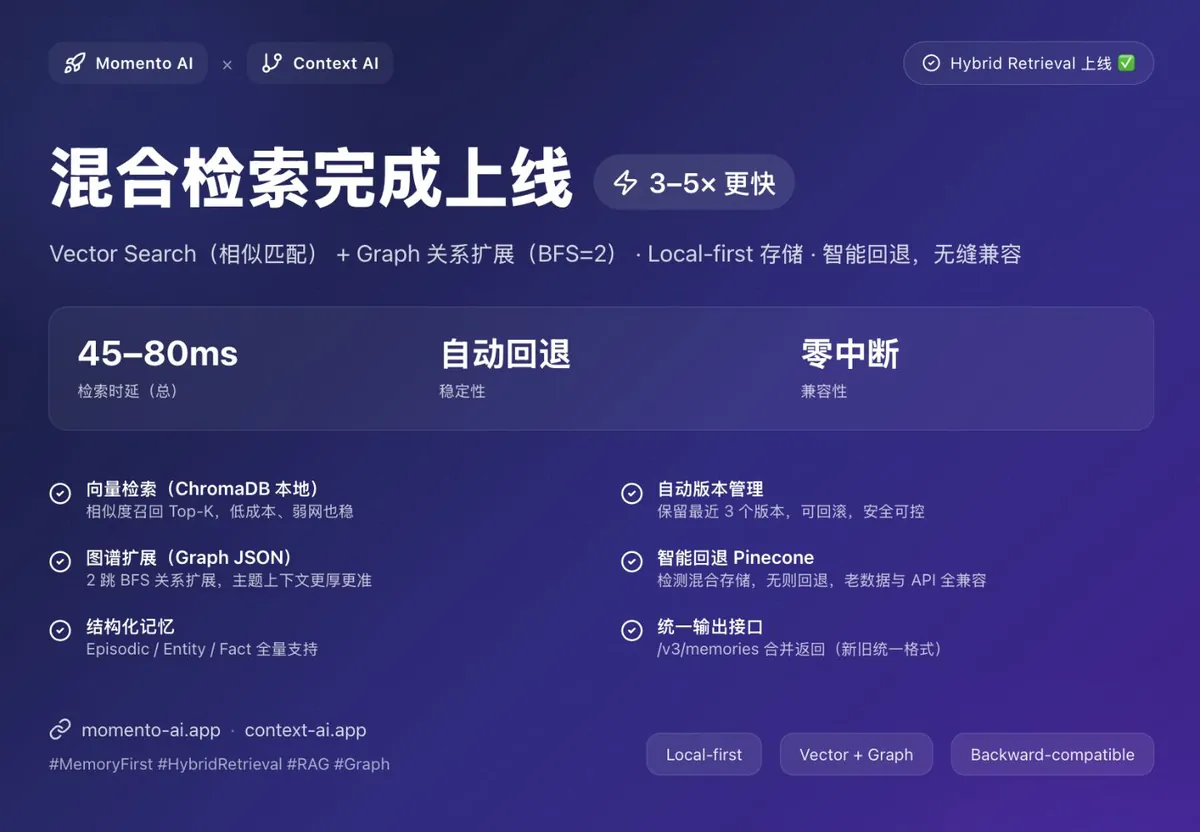 Momento AI x Context AI:完成混合检索(向量+图谱)上线!语境更“厚”,Local-first,无缝接入。