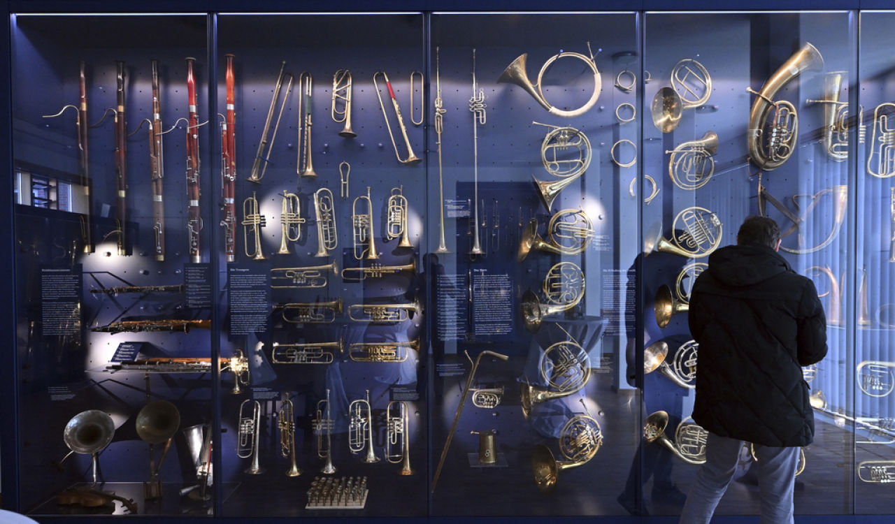 2025年是约翰·塞巴斯蒂安·巴赫诞生340周年。图为当地时间2025年3月21日,在德国图林根州艾森纳赫的巴赫故居,新开的马克·奥雷尔·赫特厅展出名为《从牛角到双铃》的展览,展示了管乐器的发展。本期节目要欣赏的乐曲也是由管乐器——长笛演奏的。视觉中国丨图