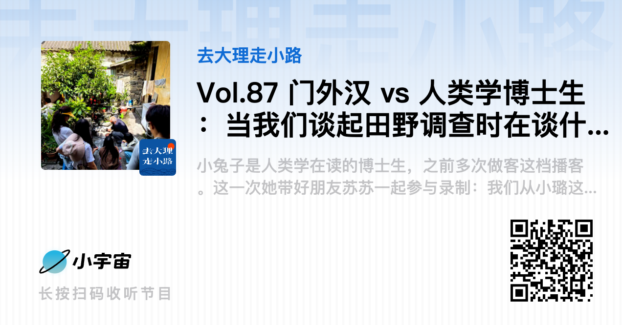 小兔子是人类学在读的博士生,之前多次做客这档播客。这一次她带好朋友苏苏一起参与录制: