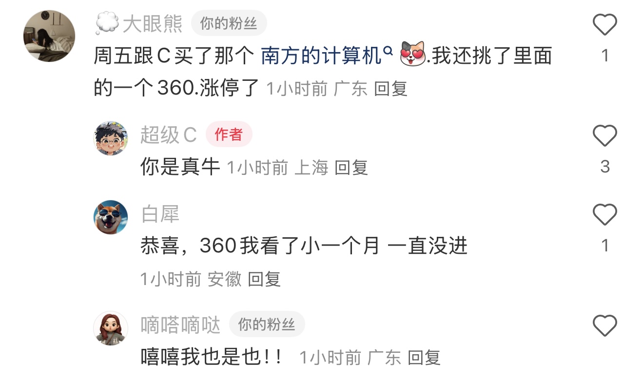 最近听了c总的策略,周末做好了复盘,选好了股,今早三分之一仓位上车一只票十点半涨停,真的特别感谢c总和眼哥的无私分享。哈哈哈,只不过眼哥每天的复盘时间太长了,我多数时候听不完