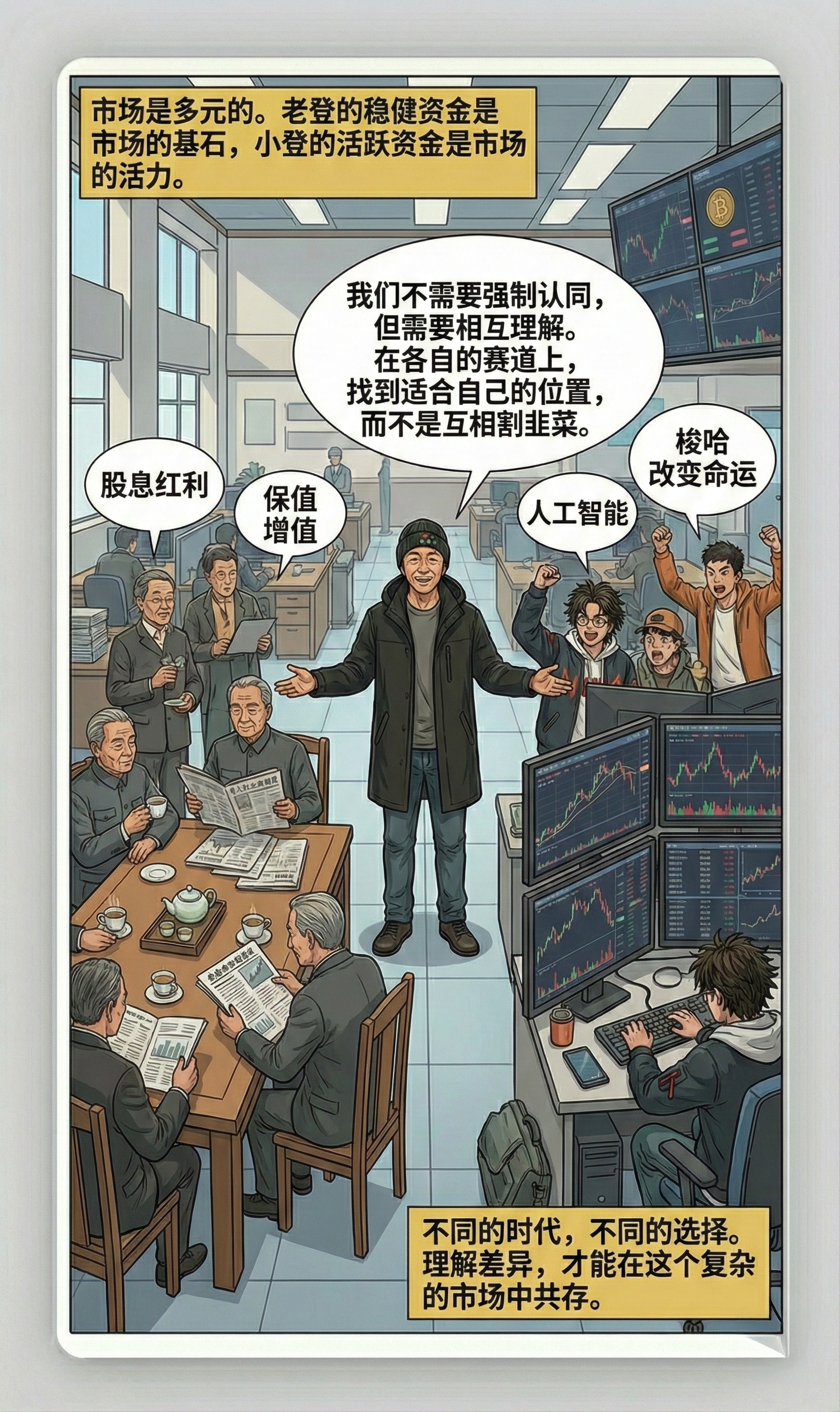 总结了老登和小登在投资逻辑上的差异,强调不同背景、年龄和财富水平的人会有不同的投资选择。他提到,老登和小登在投资中的表现反映了他们不同的生活阶段和风险承受能力,不能简单地说谁对谁错。付朋还指出,老登和小登之间应寻求相互理解,而不是强求认同。他总结道,投资者应根据自己的情况做出合理的选择,而不是盲目追随他人的投资逻辑。