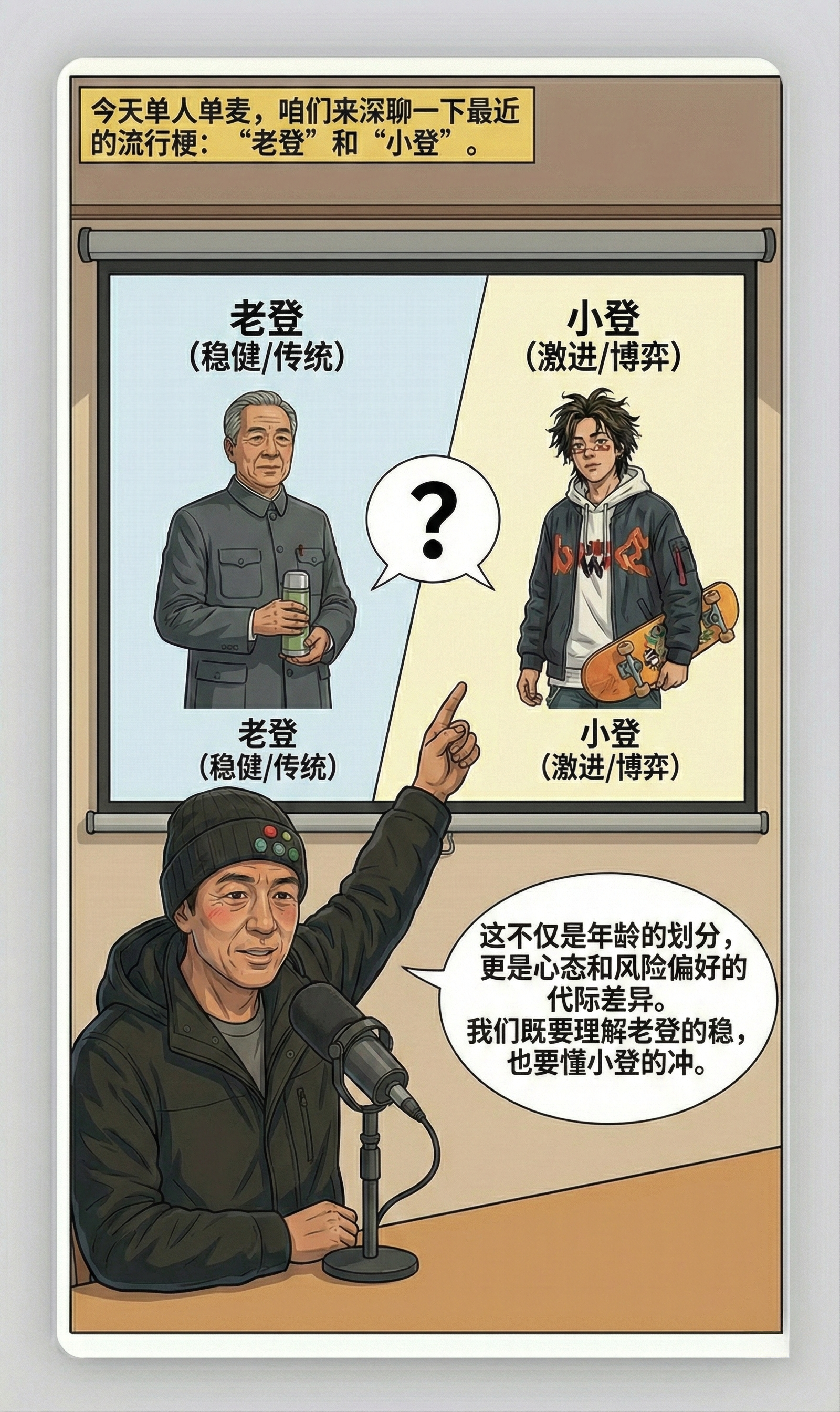 本期内容主要探讨了“老登”和“小登”这两个网络热词的含义及其在投资领域的应用。“老登”通常指年长的投资者,倾向于稳健投资,而“小登”则指年轻投资者,偏好高风险高回报。两者在风险偏好、投资策略和财富管理上存在显著差异,老登更注重低风险配置,小登则更愿意冒险。会议强调,无论是老登还是小登,都应相互学习,理解对方的投资逻辑,避免极端行为,寻求合理的投资平衡。