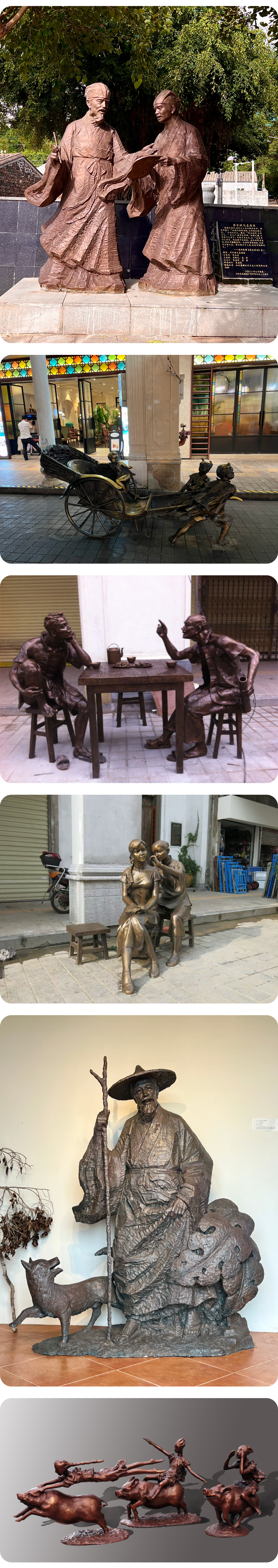如今,海口骑楼老街最网红的雕塑打卡点,原来是他做的!“戏车”——三个熊孩子抢了黄包车就跑,最小的那个还露着屁股。拉车旁边专门留了座位给游客拍照,现在这组雕塑已出现在无数人的朋友圈和相册里。另一组“送别”则记录了下南洋时代:瘦弱的母亲,左手牵着哭泣的孩子,背上还背着襁褓中的婴儿...