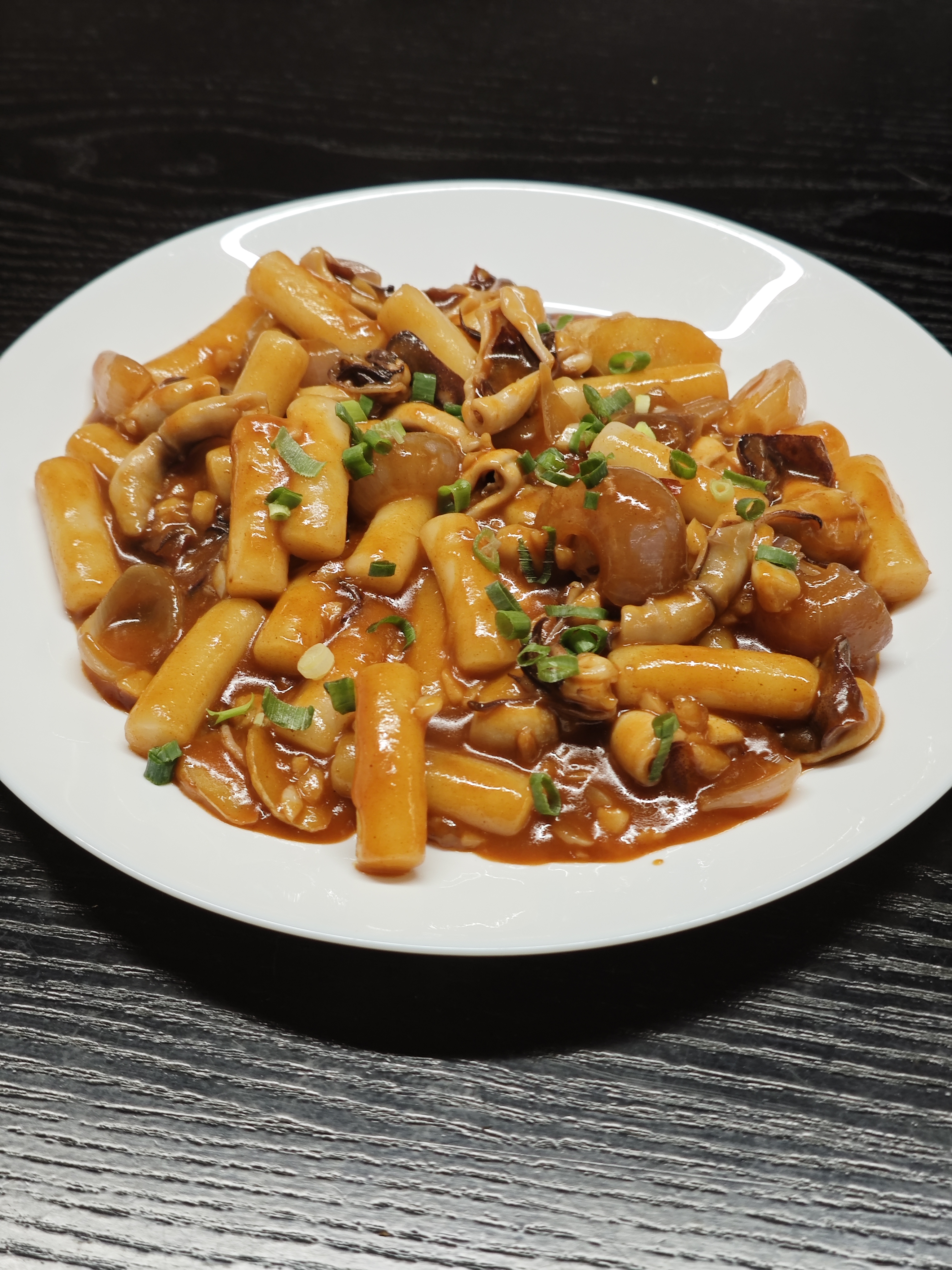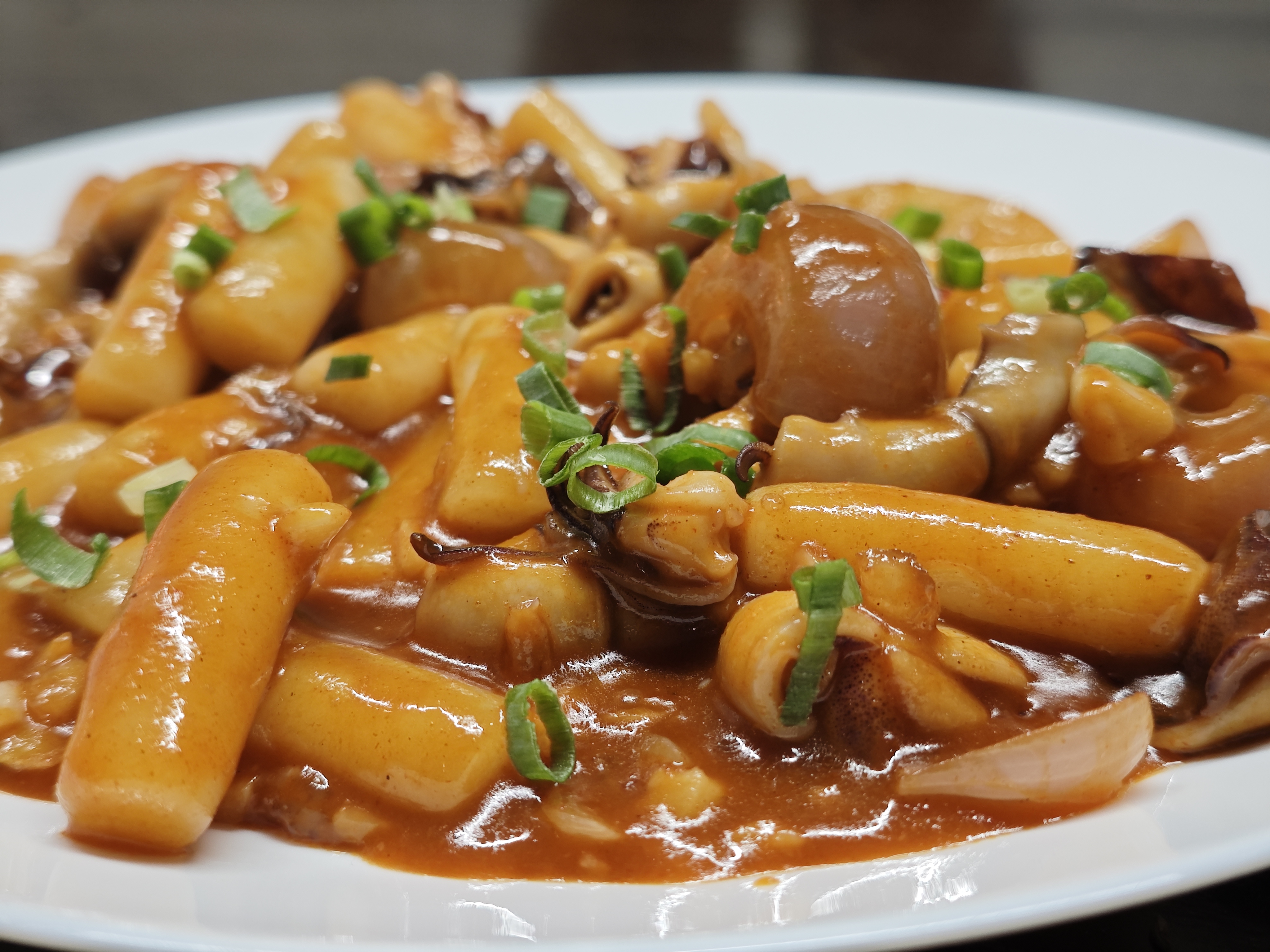 辣炒章鱼年糕:章鱼仔(或小鱿鱼)、条状年糕、红葱头、姜、韩式辣酱一勺、酱油一勺、糖半勺、淀粉一勺