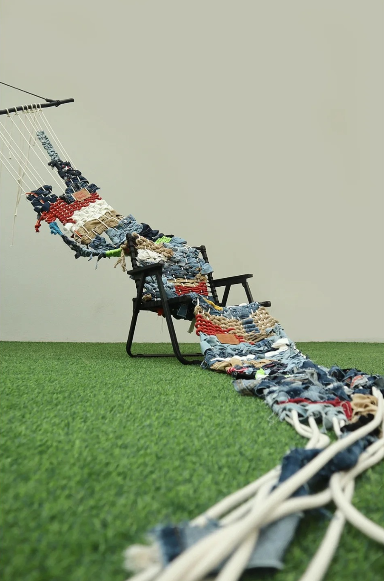 ⬆️装置作品《无中生有——过往生活的自由生长》,用户外折叠椅、长麻绳、废弃树枝、废旧牛仔衣物等编织而成