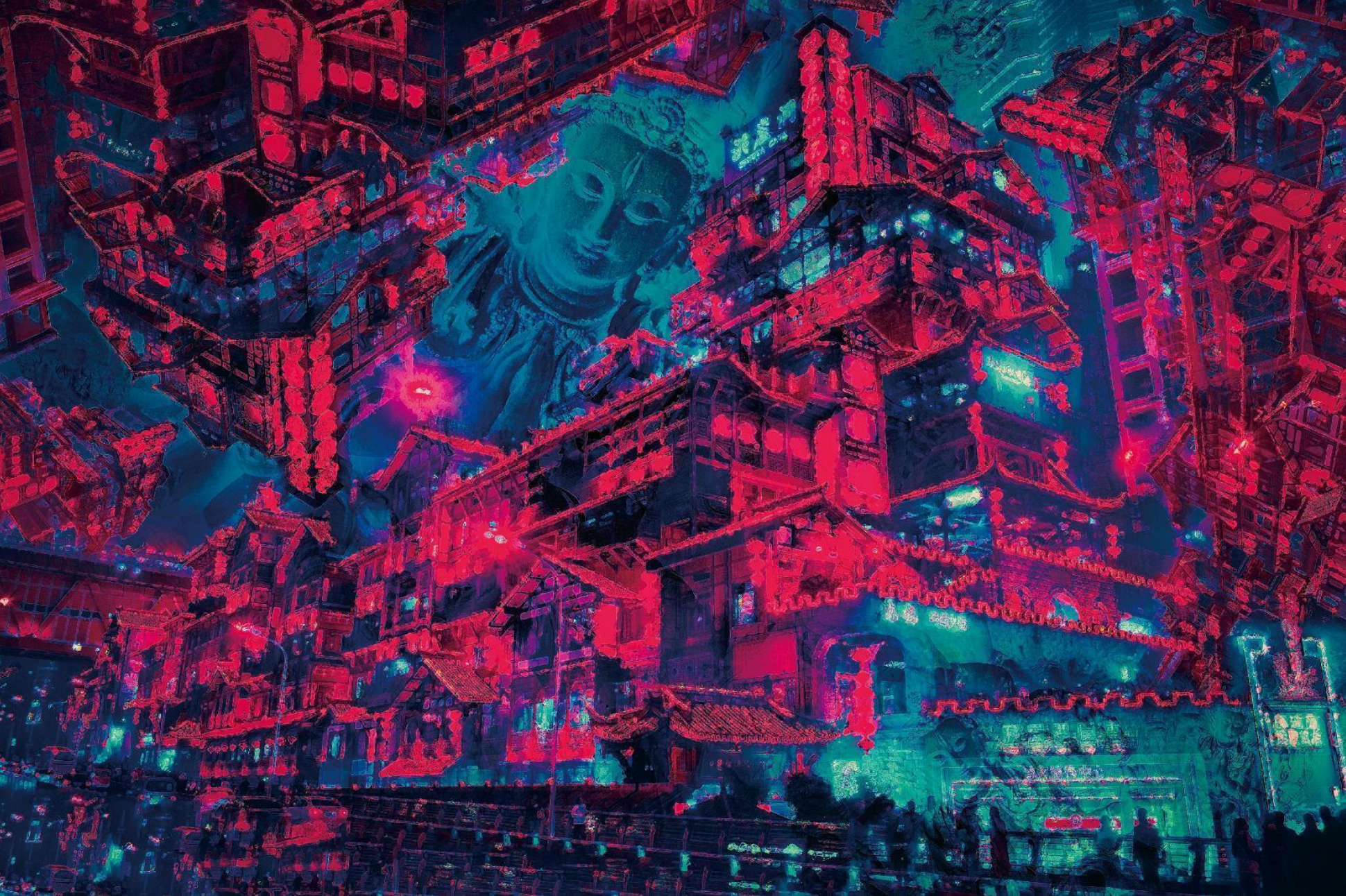 《俯仰》,该作品是胡威威“时间设计”哲学的典型代表。他通过独特的视觉合成技术,将敦煌的千手观音与重庆洪崖洞的世俗景观并置于同一画面,创造出一种极致的文化冲突与时空折叠。作品在宗教的崇高与商业的喧嚣之间建立对话,迫使观者思考精神追求与物质现实在当代社会中的对立与共生关系。