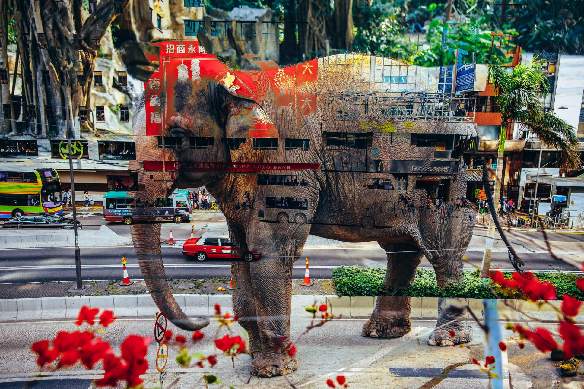 《不见》,一件充满超现实意味的观念摄影作品。艺术家胡威威将一只在云南拍摄的大象,“携带”至三个月后的香港中环街头进行数字融合。巨大的象躯与繁华的都市街道形成荒诞而强烈的视觉对比,旨在揭示现代人在信息爆炸时代下对周遭事物的麻木与“选择性失明”,以强烈的视觉隐喻叩问“看见”与“感知”的真相。