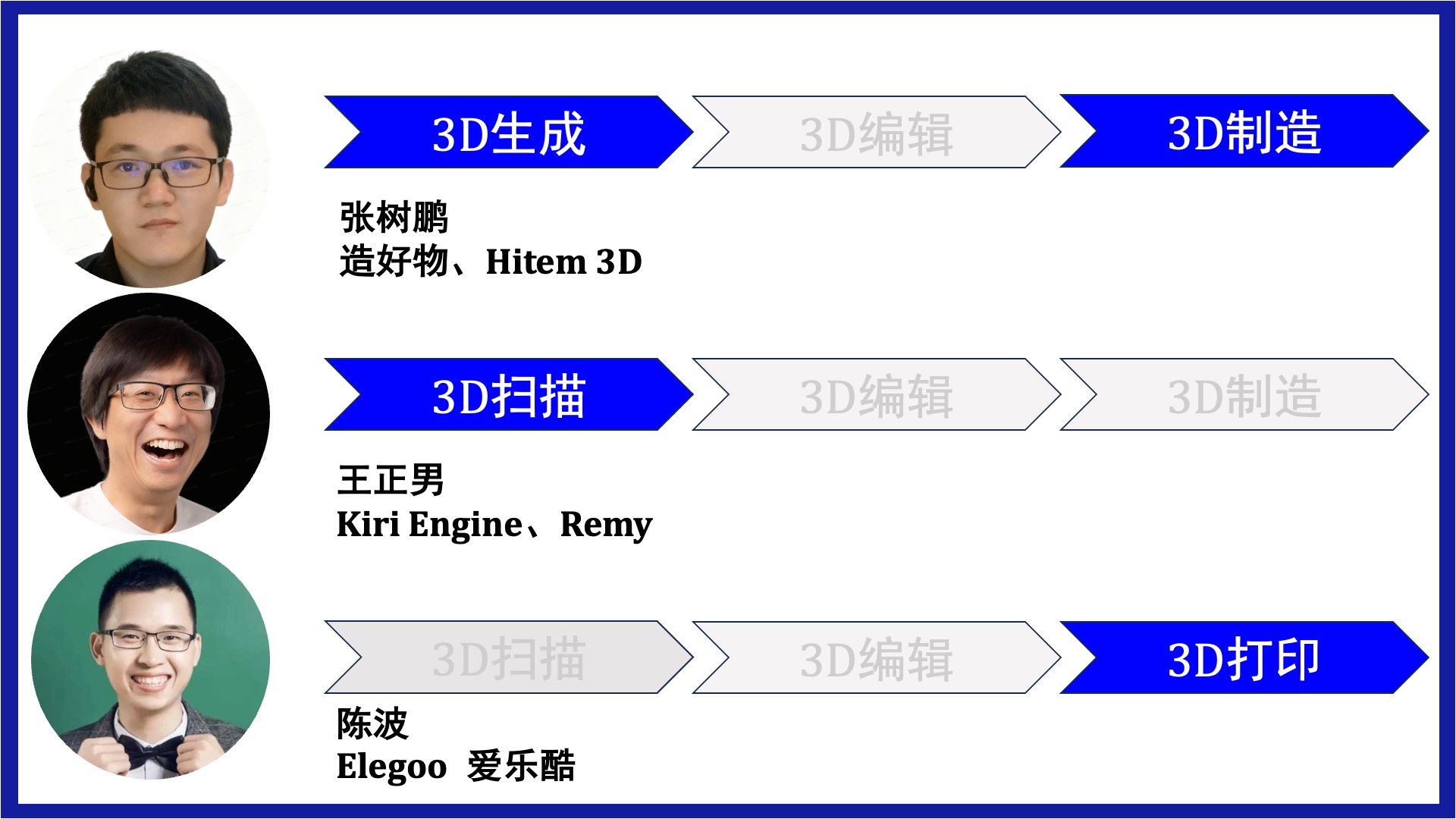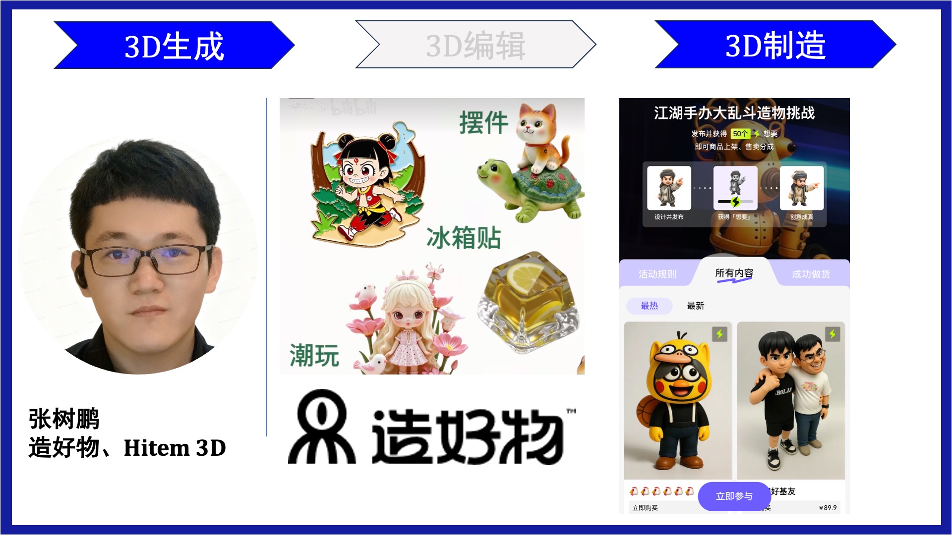 - 3D生成代表:张树鹏(“造好物”社区/“Hitem 3D”的产品负责人,来自获得红杉、IDG、美团等机构投资的创意造物平台”数美万物“) zaohaowu.com、hitem3d.ai