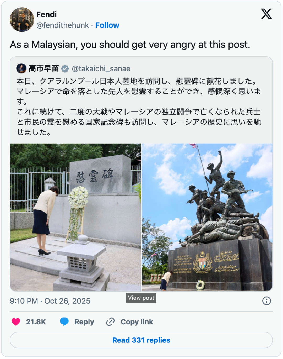 00:11:46: 马来西亚网民愤怒声讨高市:日本是否就入侵公开道歉过?