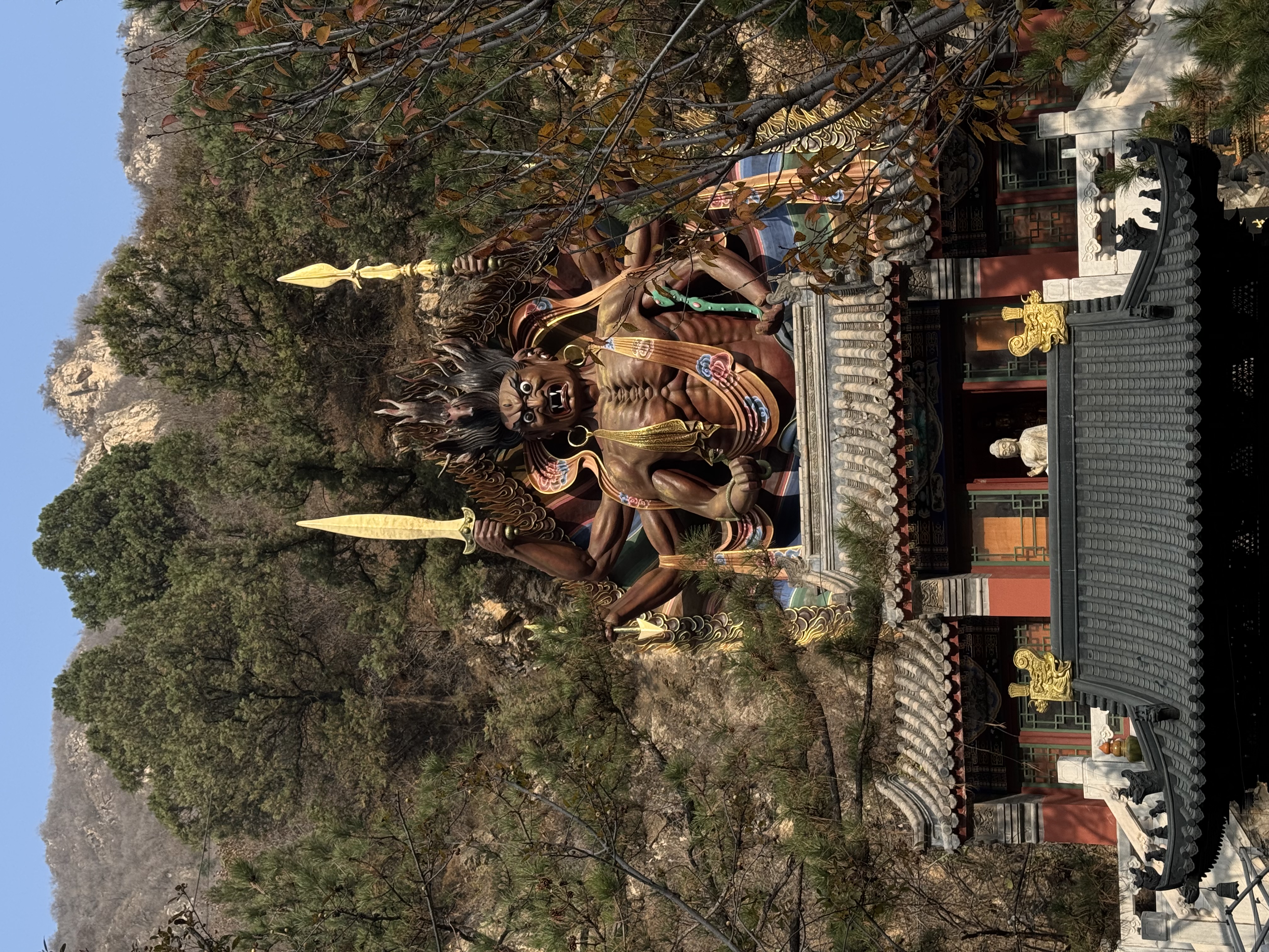 白瀑寺风格独特,被戏称为“佛教主题乐园”,拥有巨大的车神庙、云端飞龙等混搭风格雕塑,视觉冲击力极强。去往白瀑寺的路途极具挑战,最后一段陡坡让众多车友不得不推车。虽非传统古意风格,但其现代工艺精湛,是一个独特且有趣的骑行打卡地 。