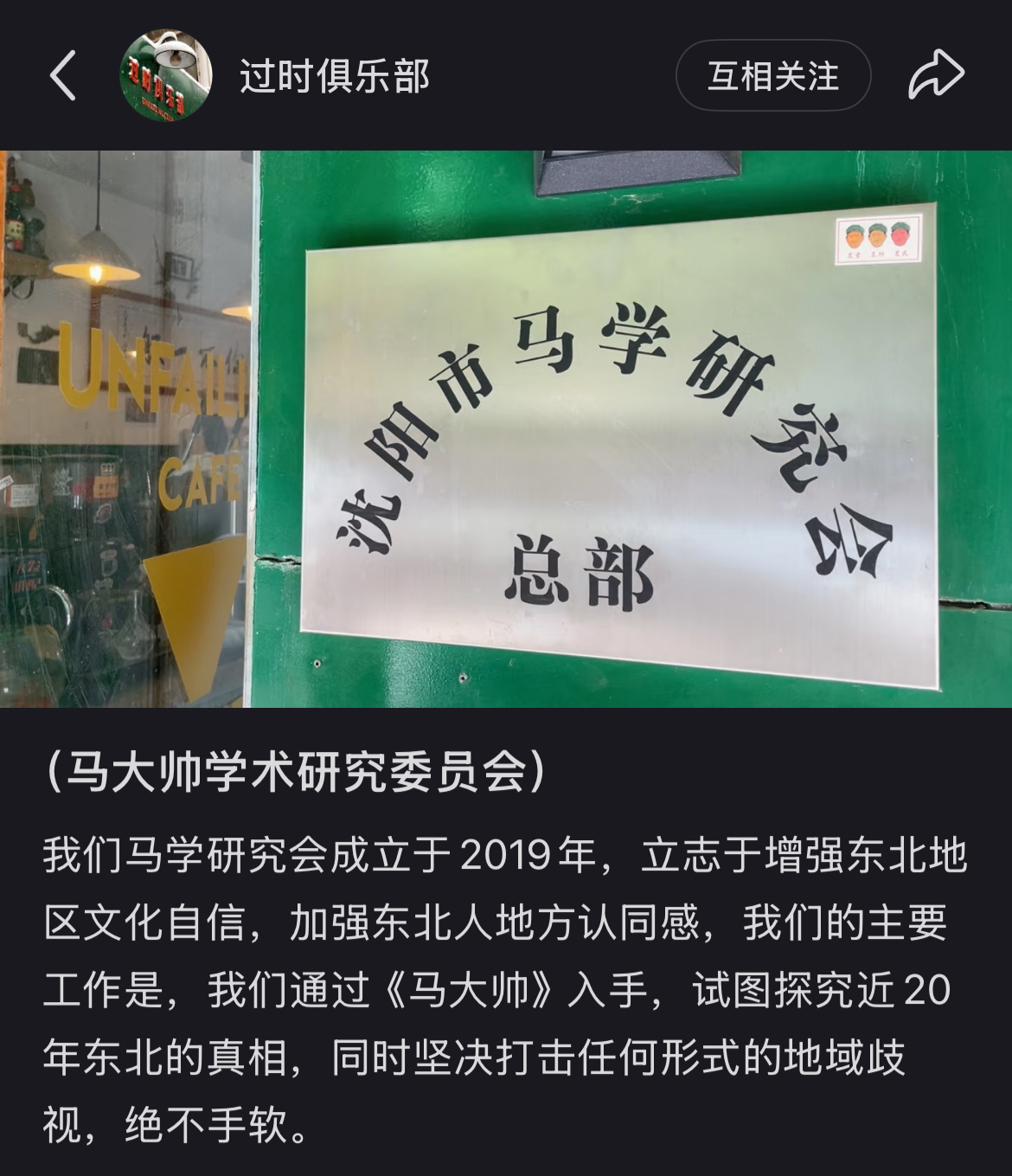 我们马学研究会成立于2019年,立志于增强东北地区文化自信,加强东北人地方认同感,我们的主要工作是,我们通过《马大帅》入手,试图探究近20年东北的真相,同时坚决打击任何形式的地域歧视,绝不手软。