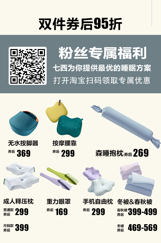 另外需要他们家「七西枕头」优惠的听友们这次也可以关注一下,枕头是有科学分区的设计,更适合颈椎生理曲线,不会让你睡醒肩颈酸痛,落枕,实现翻身自由,可以快速进入深睡眠状态;独特的分码设计可以根据人体的身高体重,头围肩宽选择适合自己的睡眠枕,平时睡不好,肩颈不好的可以去了解看看。