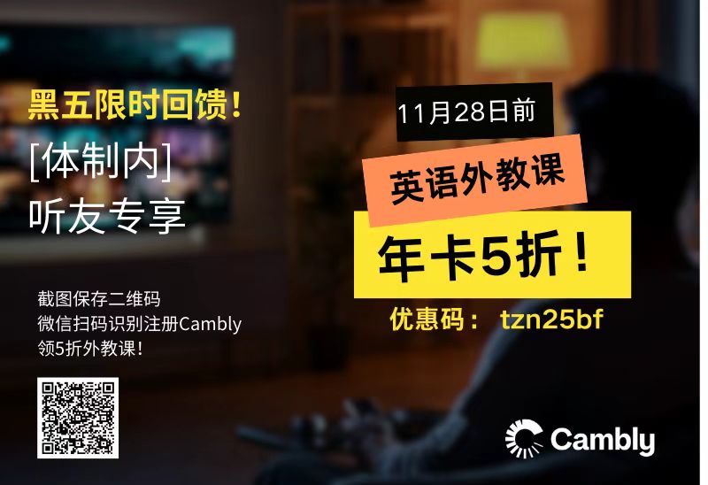 即日起至黑五结束,播客听友可享年卡5折、季卡7折优惠,只限5天!新用户还可领取4节体验课。1对1和外教交流整个世界,只要40元一节课!
