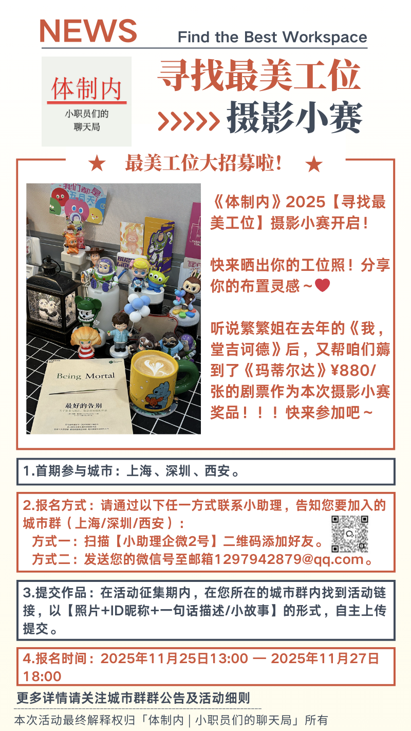 另外再同步一下,我们播客近期会在听友群搞一个“寻找最美工位摄影小赛”(征集时间截止到2025年11月27日),第一期我们放在上海、深圳、西安三个城市群,因为有很惊喜的奖品,想要参加的小伙伴,请扫码小助理企微2号的二维码,或者发送你的微信号到1297942879@qq.con邮箱,告诉小助理你要进上海、深圳、西安群就可以啦~
