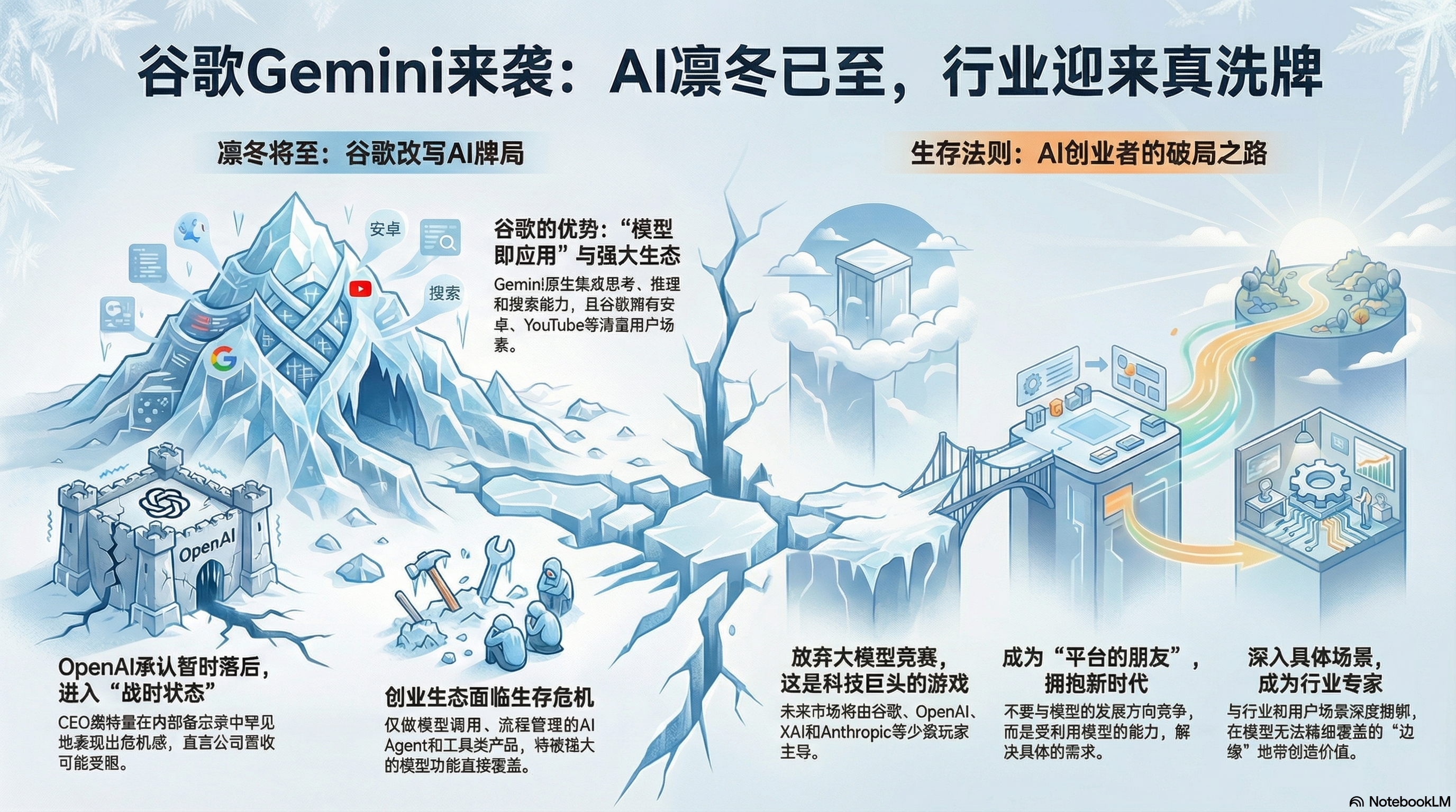 主要讨论了谷歌发布Gemini 3 Pro和Nano Banana Pro后对整个AI行业,特别是OpenAI造成的巨大冲击。OpenAI首席执行官山姆·奥特曼罕见地承认了危机感,要求团队进入“战时状态”,因为谷歌的快速进步给OpenAI带来了经济阻力。作者认为,谷歌在AI领域的突破,结合其庞大的用户生态系统,对依赖外部资金和算力合作的OpenAI及其生态构成巨大威胁,并可能终结现有行业中的“击鼓传花”式投资游戏。同时,作者提醒AI开发者和创业者,模型即应用的趋势日益明显,建议他们不要再尝试开发基础模型或会被未来模型功能覆盖的工具,而应专注于与具体用户场景和行业深度结合的定制化应用,以迎接AI技术跨越“可用临界点”后带来的大爆发机遇。
