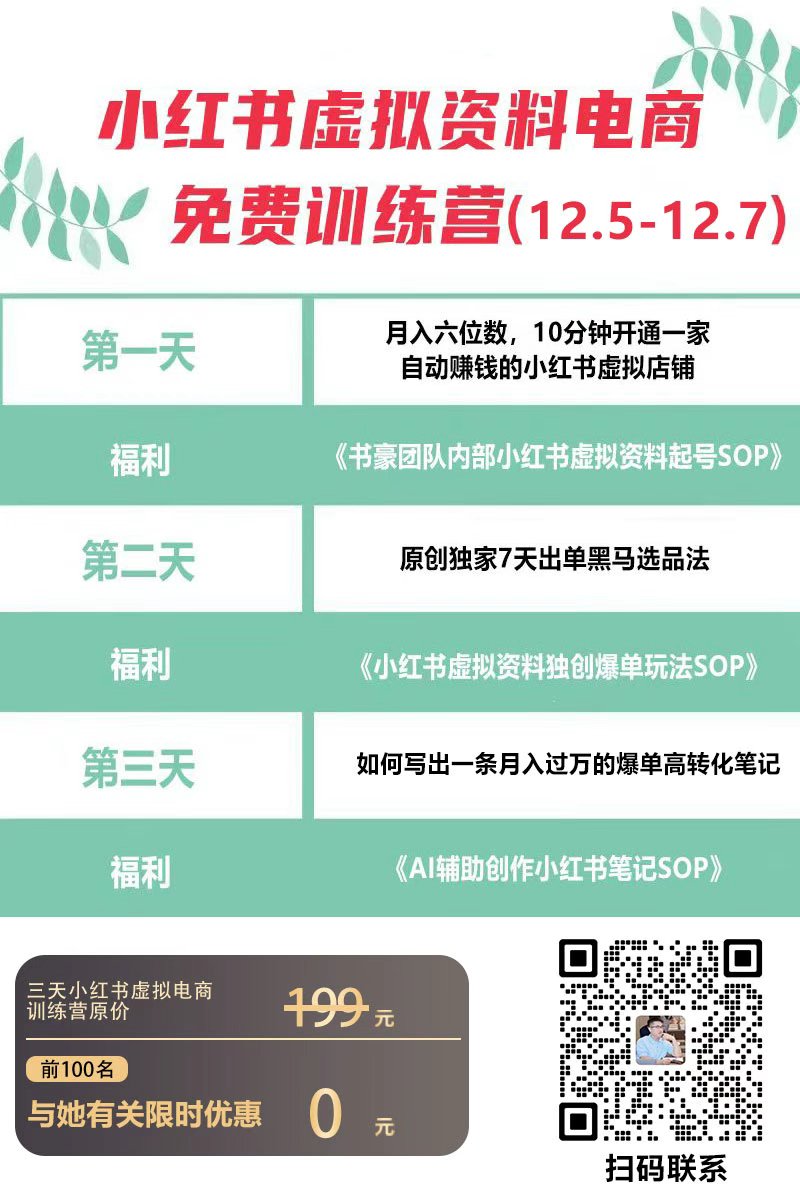 价值199元三天小红书虚拟电商训练营(12.5-12.7)最扫码下方海报或者搜索嘉宾微信(CEOSH888),备注“与她有关”,如果搜不到,可以扫码下面海报二维码添加书豪企业微信!