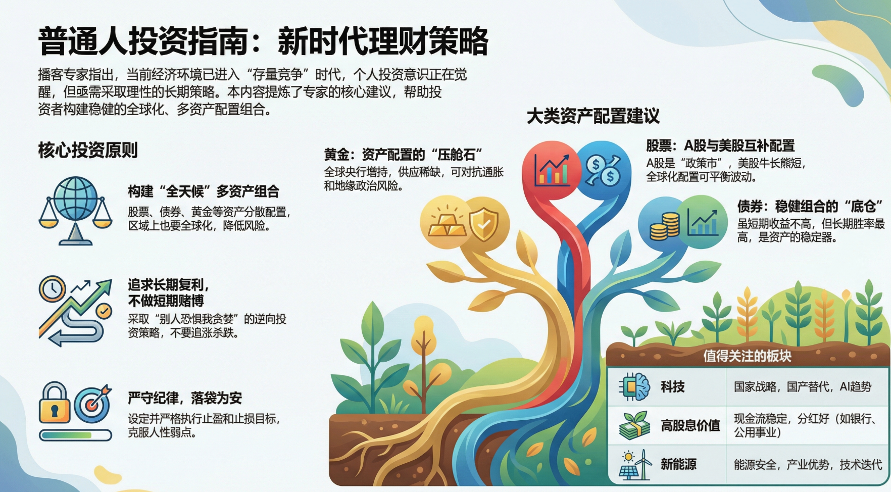 - 黄金: 无论市场牛熊,家庭资产中一定要配置黄金(10%至20%),用以抵抗地缘政治风险和抗通胀。