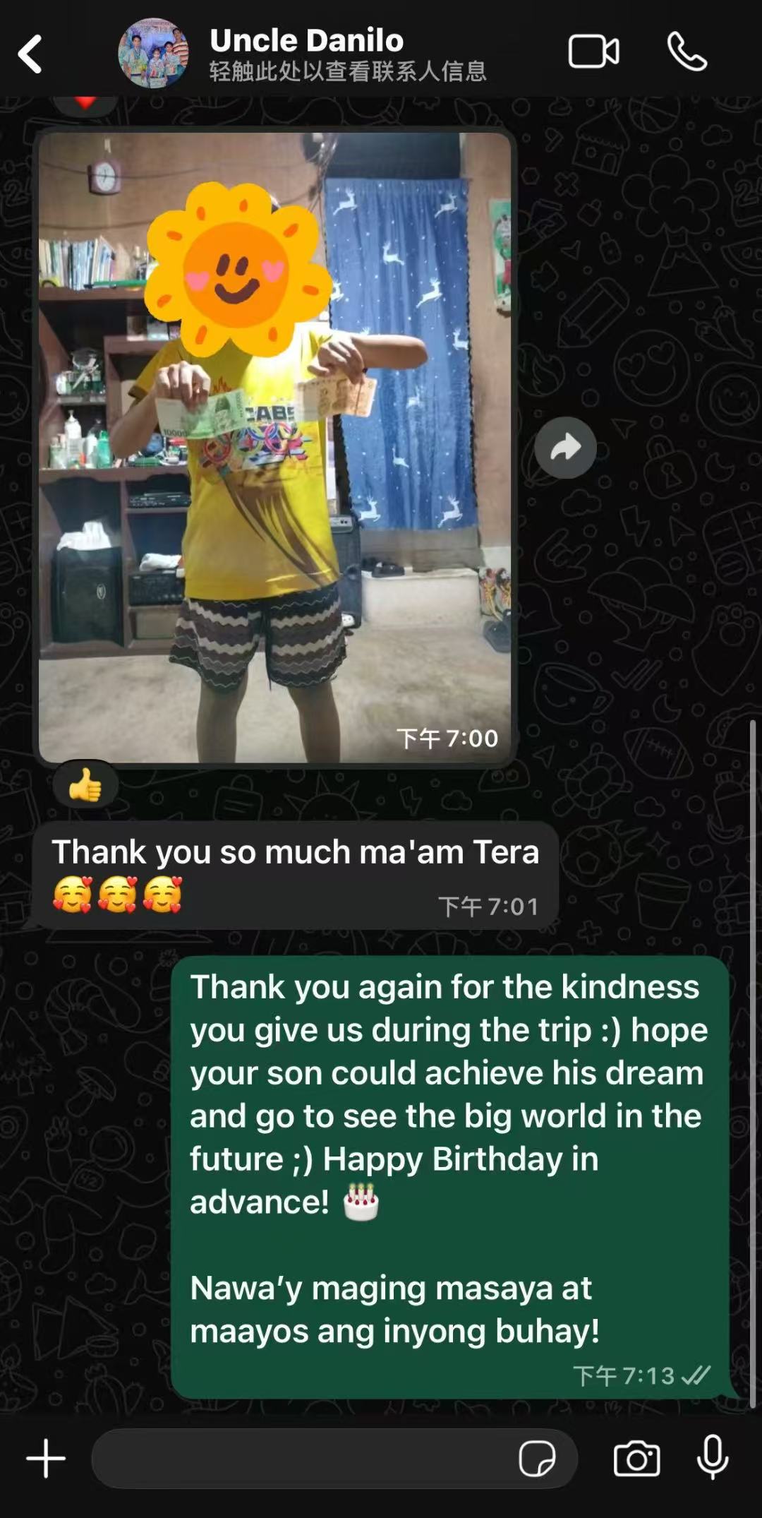 这张截图是Tera临走时给Uncle Danilo发的,呜呜呜,感动。陌生人在短短几天相遇,互相给予美好,善良的人们。我们永远的叔叔!Tete还特地学习了菲律宾语的祝福!