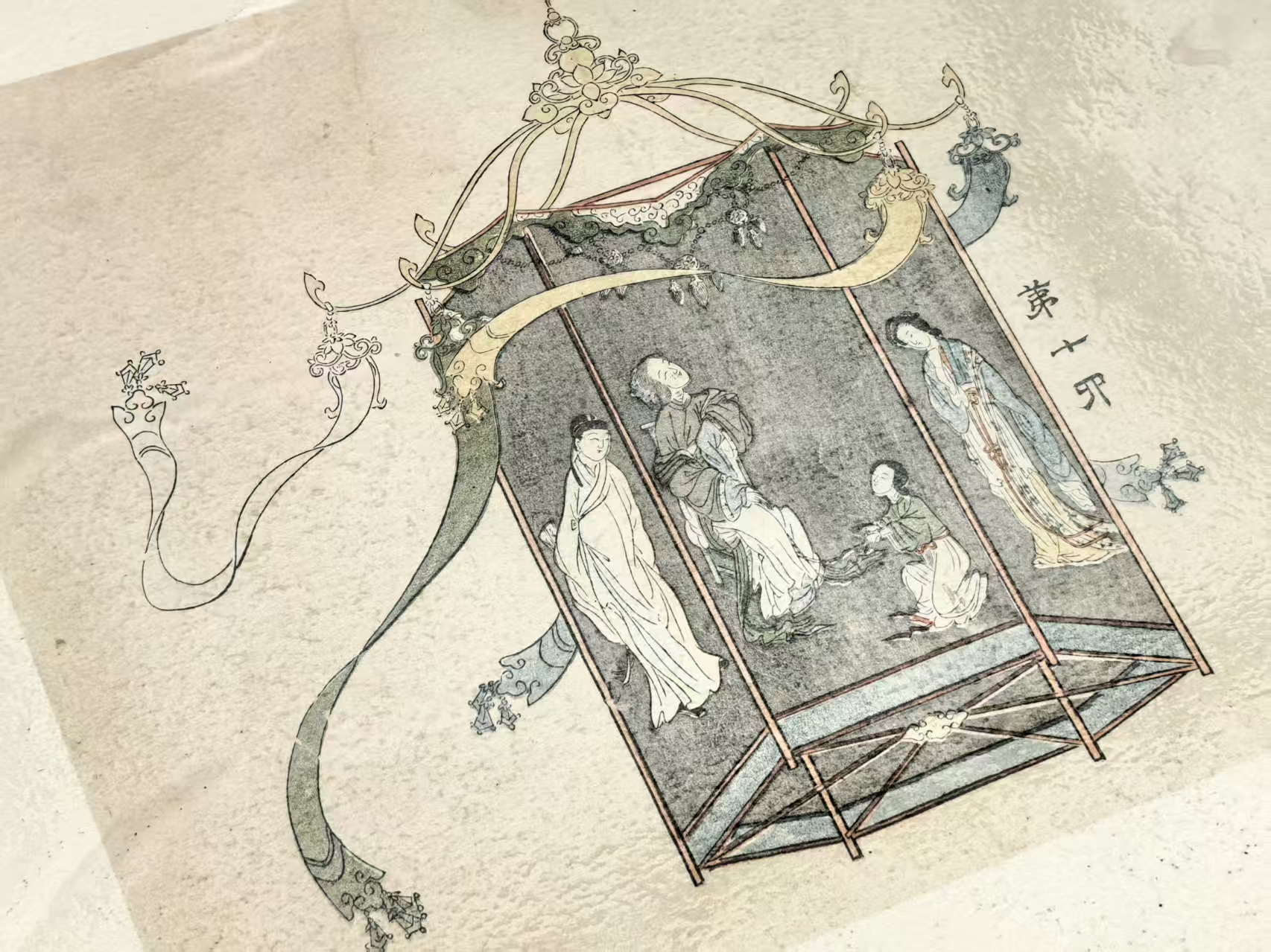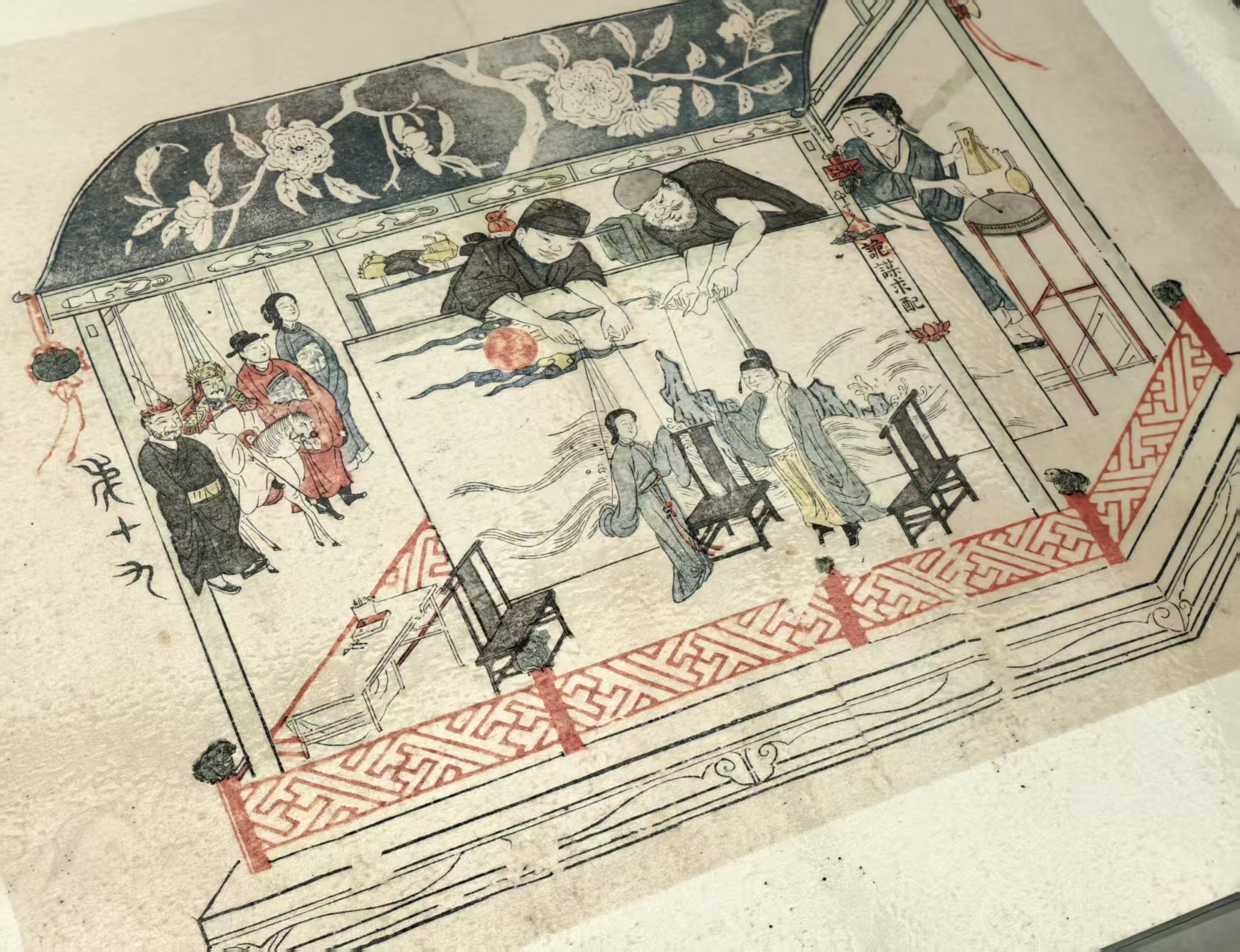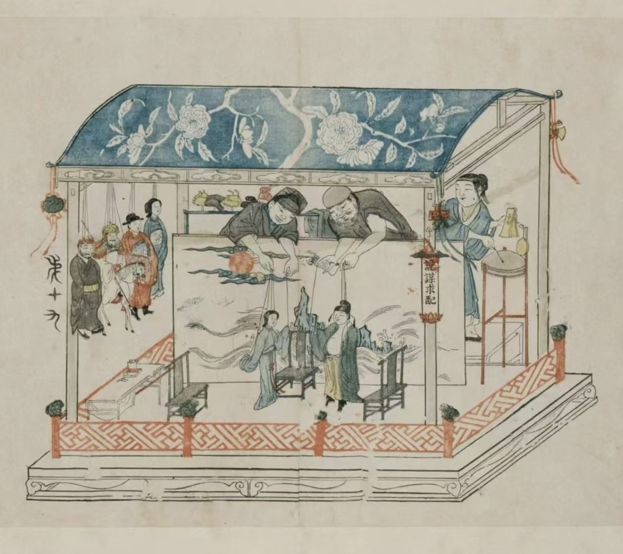 此幅绘傀儡戏一场,是以“戏中戏”的形式,表达社会礼教框架对个人的操控。