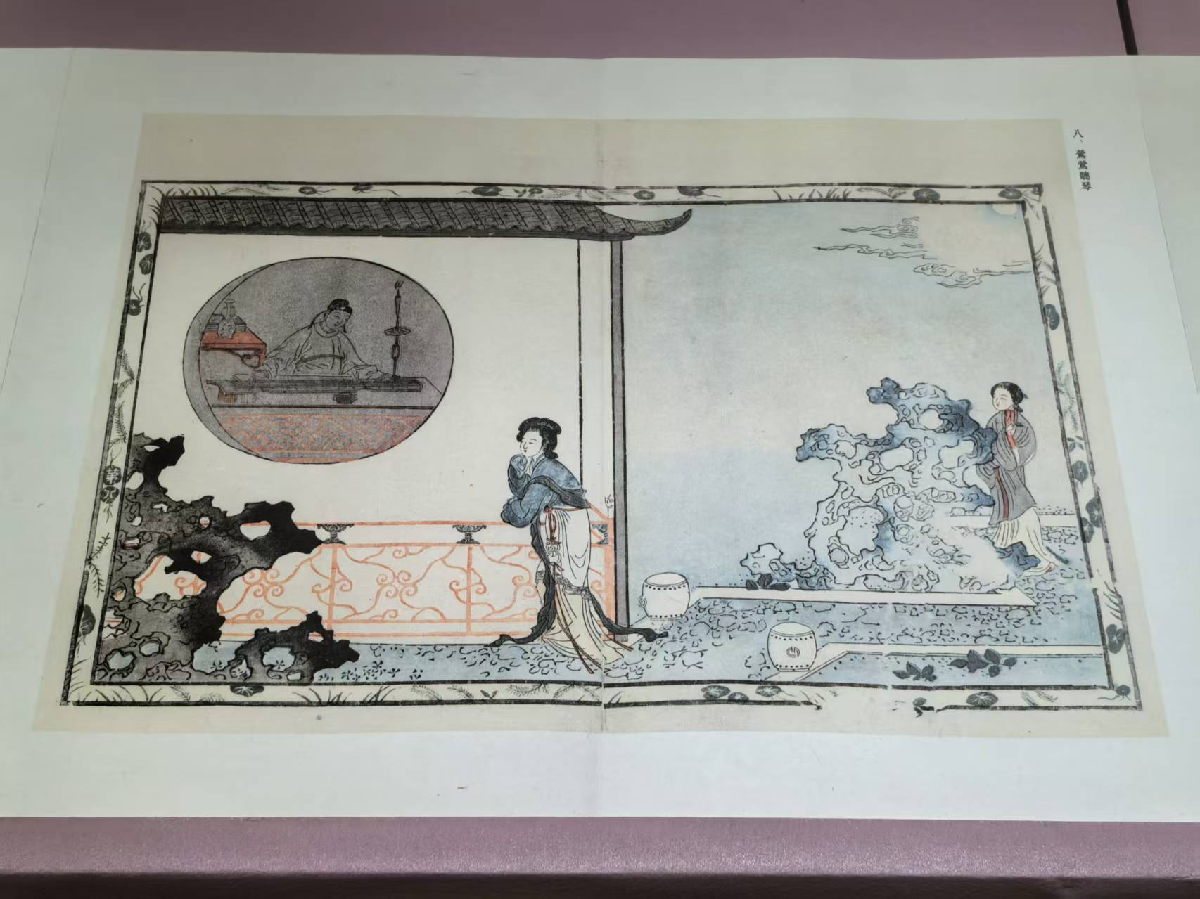 闵齐伋《西厢记》六色版画第八回:莺莺夜听张生灯下抚琴。