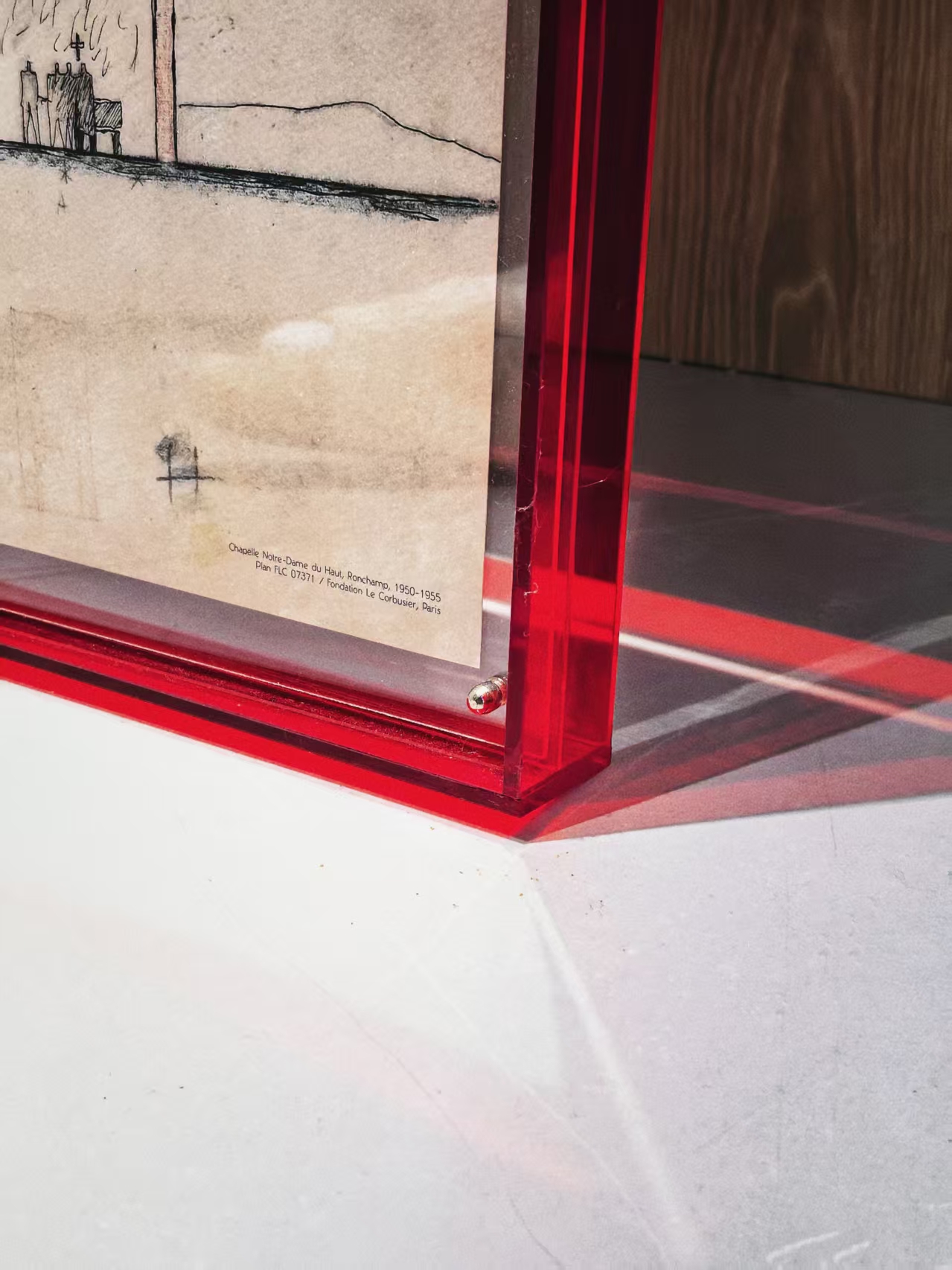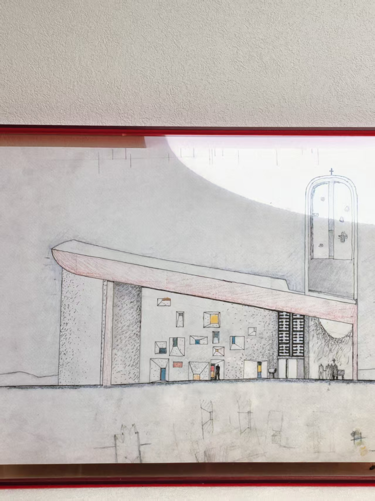 最后,是柯布西耶朗香教堂的设计手稿。那天在山顶,光从狭长的彩色玻璃窗洞倾泻而下,我们闭上眼睛,坐在穹顶之下,仿佛听到柯布西耶在说:我只想盖一座让人类离天堂更近的房子。大师最有魅力的瞬间,就是他背叛了他自己,所以这幅手稿被我们装进半透明框里,每当晴天阳光照到它身上的瞬间,就会真的如朗香教堂一样亮起来。