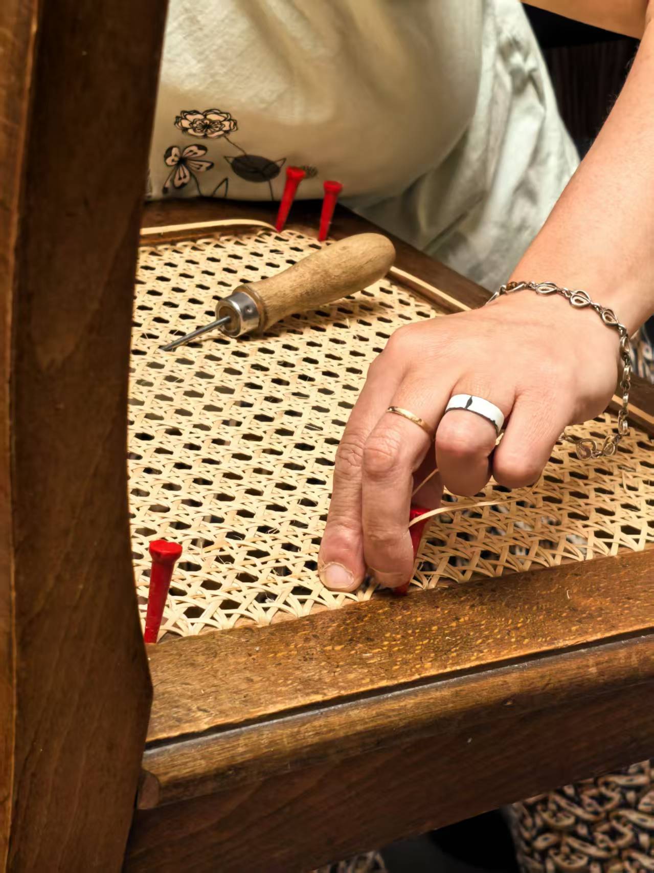 盲人正在用传统藤编技术编织坐椅