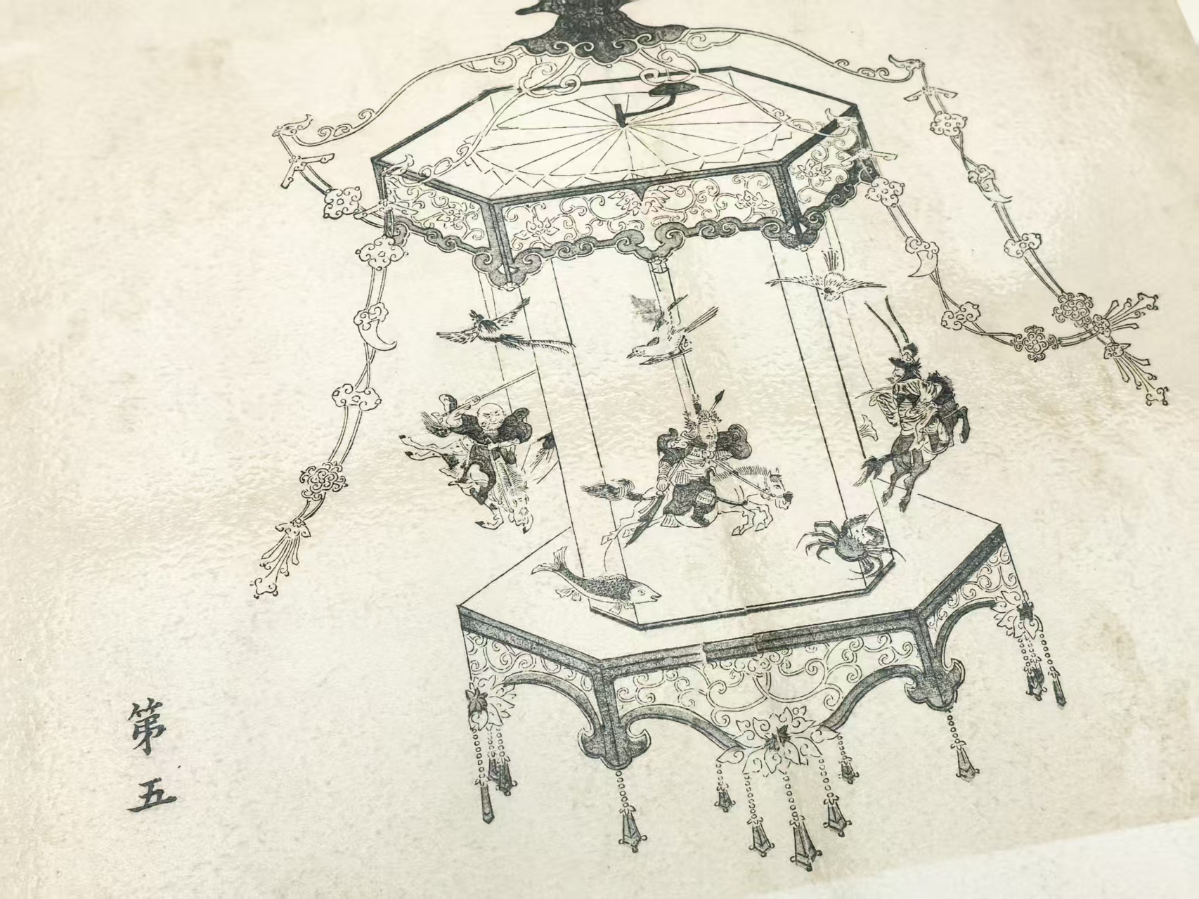 借用民间工艺走马灯的形式,展现三骑飞驰追逐的动态,既烘托气氛,又暗合“世事如灯转”的禅意。