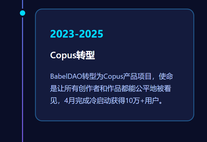 2023年中,BabelDAO转型为Copus(曾用名Cascad3),转变为产品项目,使命是让所有创作者和作品都能公平地被看见。